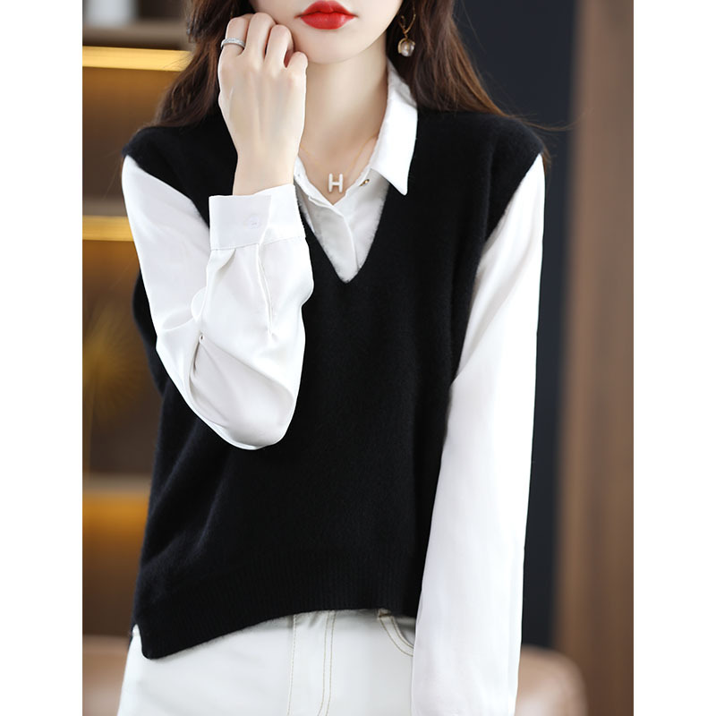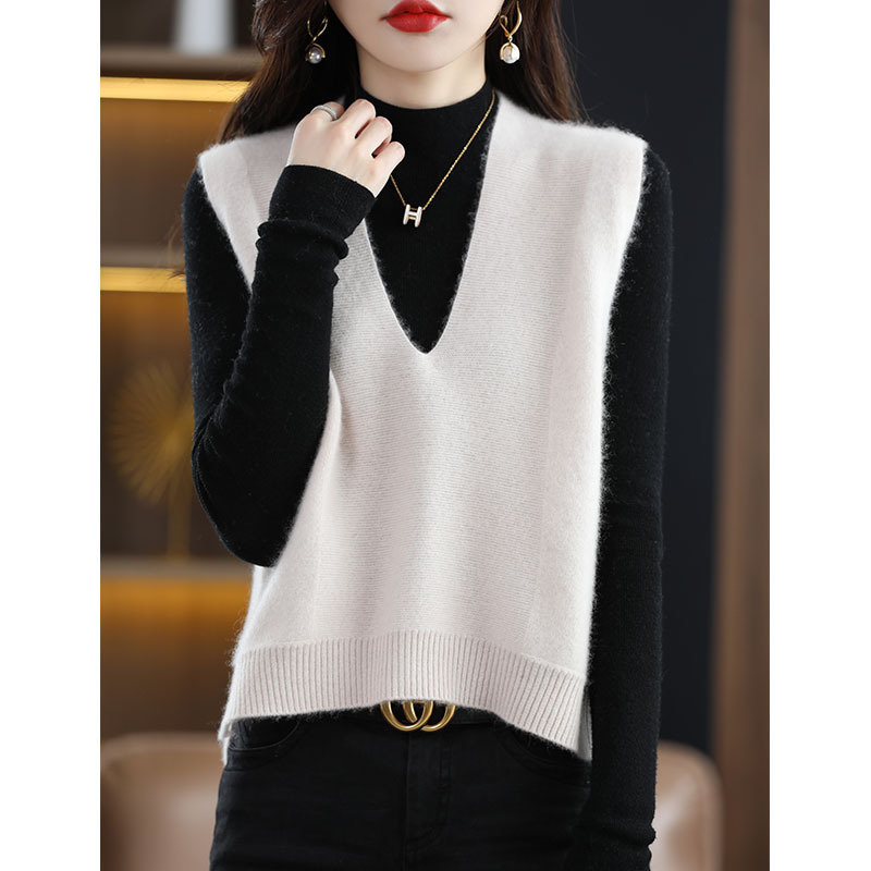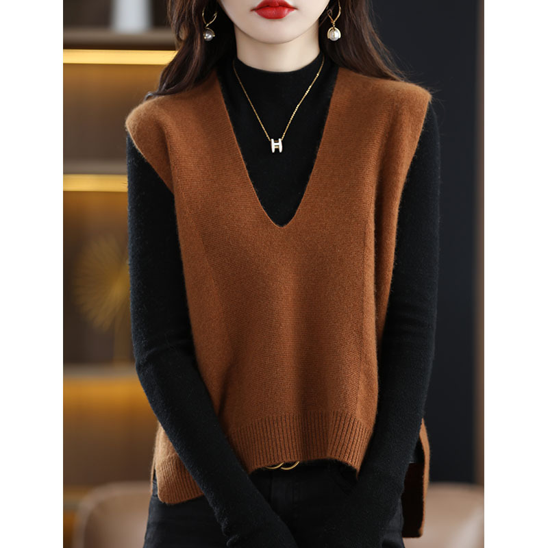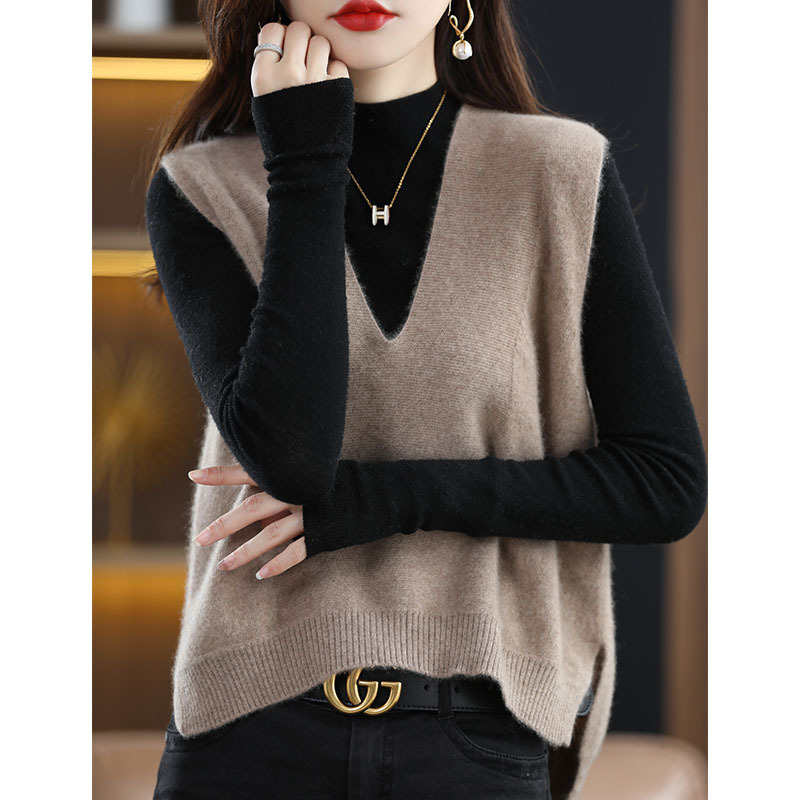 가을 여성의 평평한 단색 V-목 앞 짧은 뒤 긴 분할 느슨한 캐주얼 모든 울 니트 조끼