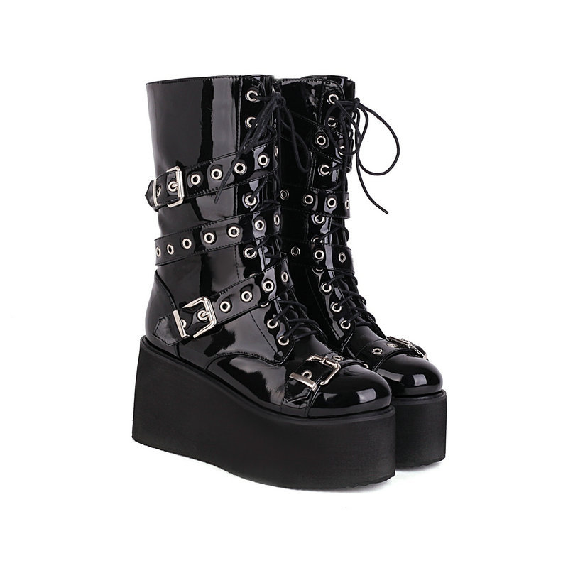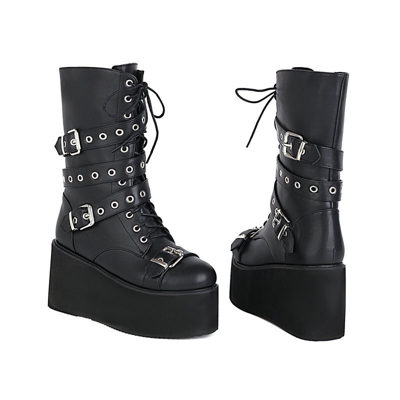 마틴 부츠 여성용 영국 스타일 플랫폼 블랙 스터드 가죽 신발 하이힐 부츠 메탈 고딕 여성용 하이 부츠