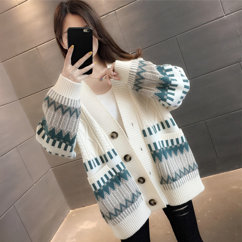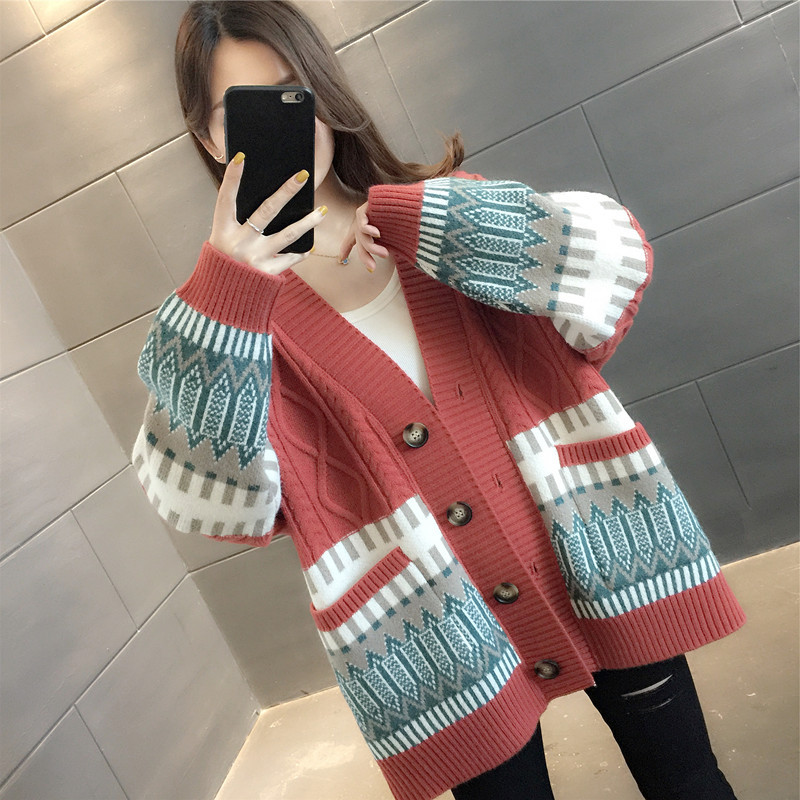 홍콩 스타일 가을과 겨울 새로운 스웨터 한국 스타일 모든 매치 게으른 스타일 에스닉 스타일 니트 스웨터 커플 캐주얼 컬러 매칭 가디건