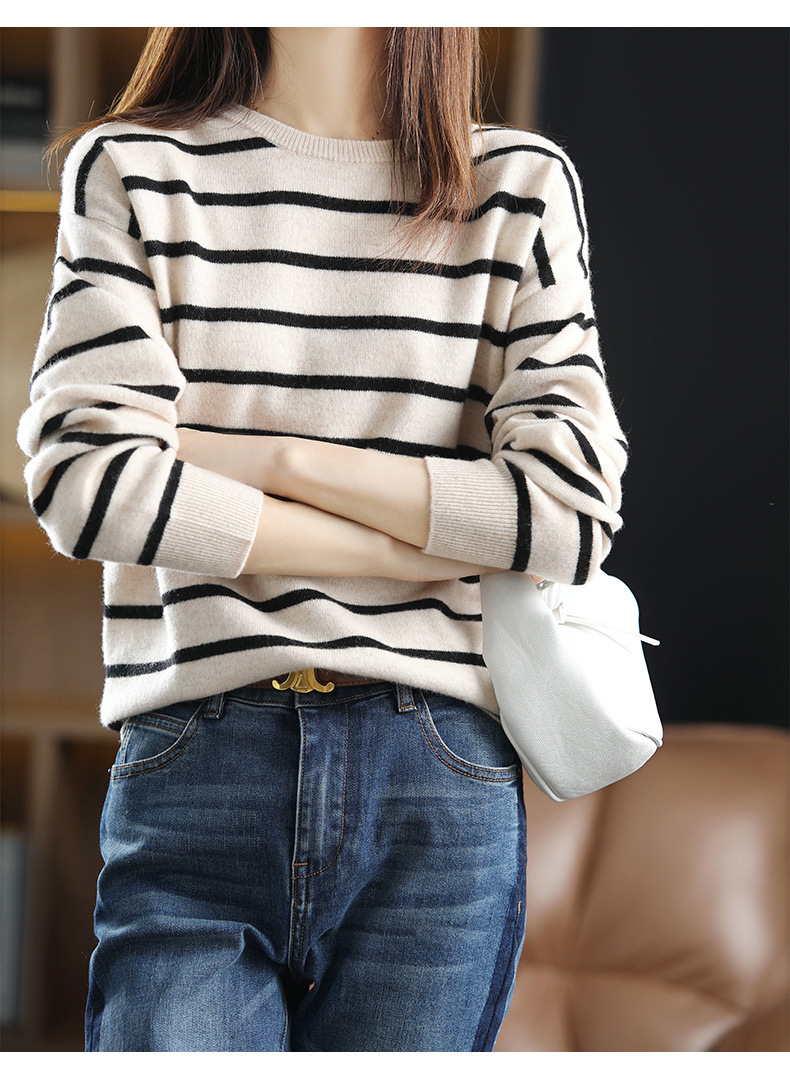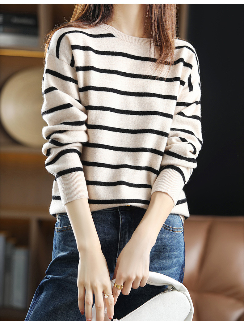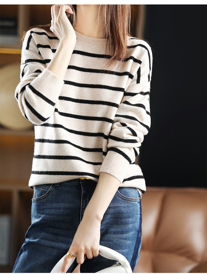여성 도매 봄 가을 새로운 느슨한 니트 스웨터 라운드 넥 스트라이프 컬러 매칭 드롭 어깨 스웨터 풀오버 바닥 셔츠