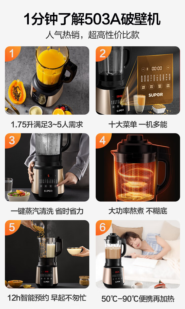 Supor 벽부수기 1.75L 다기능 예약 난방 과즙 기 보충 두유 기계 과일 과즙 기 SP503A스토어 가기