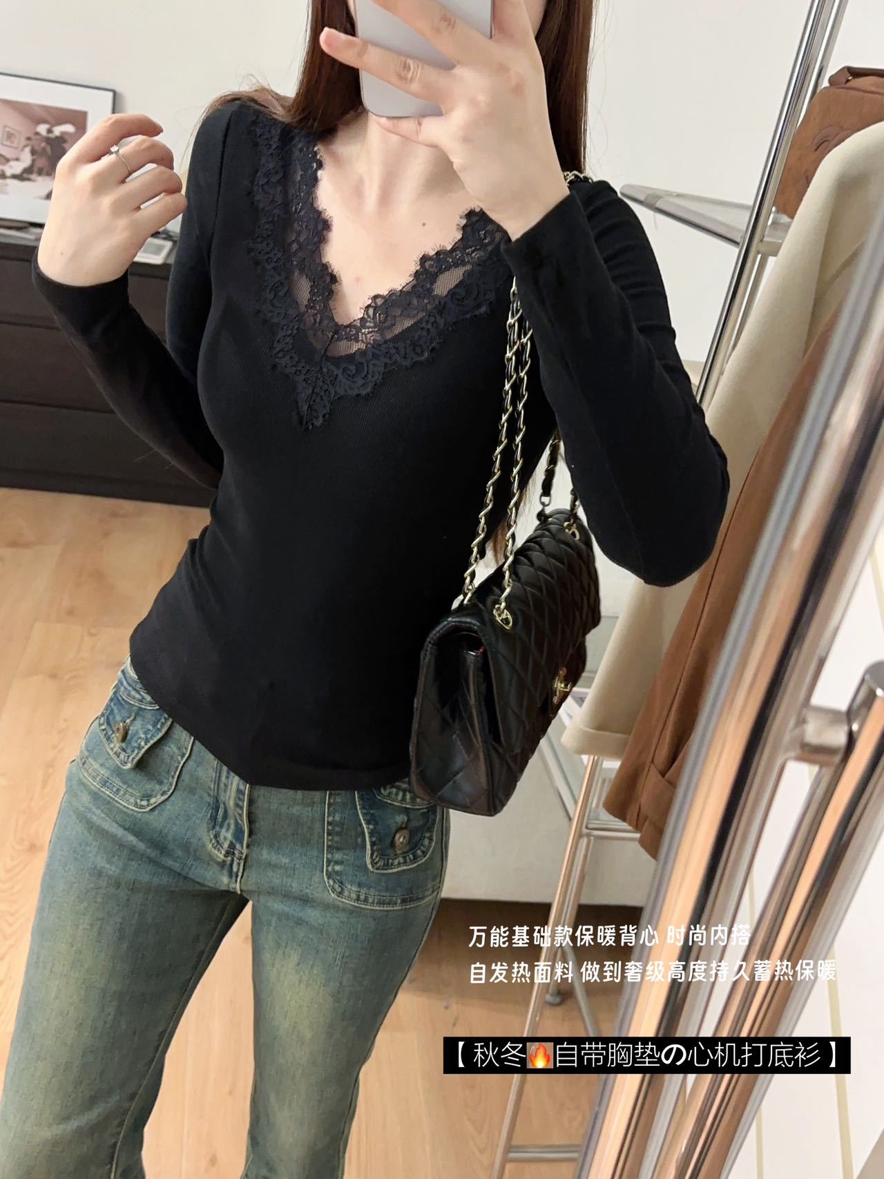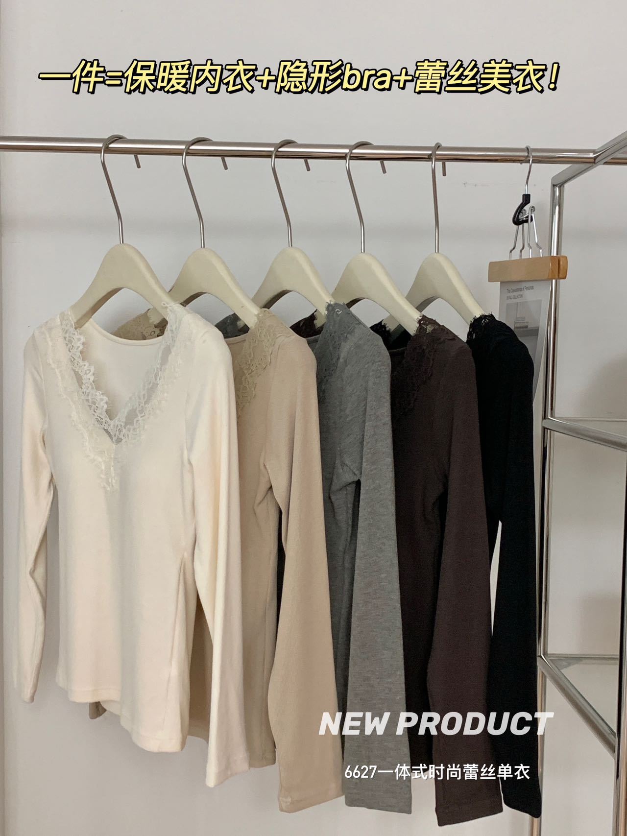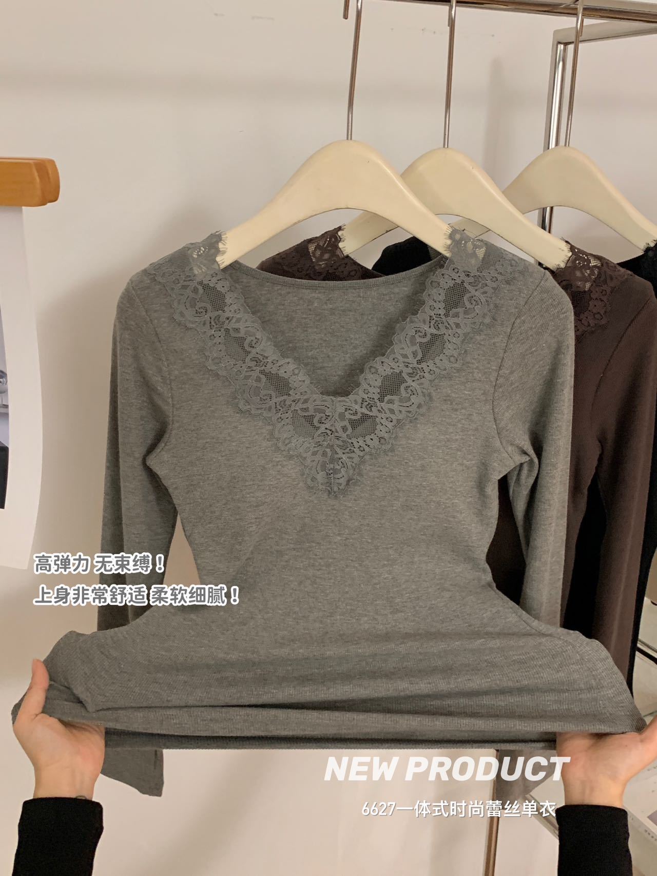 가을 겨울 신상품 원피스형 패션 레이스 브이넥 탑 브라 내장형 원피스 베이스 레이어 가을 겨울 슬림핏 # 6627