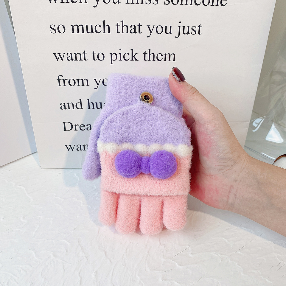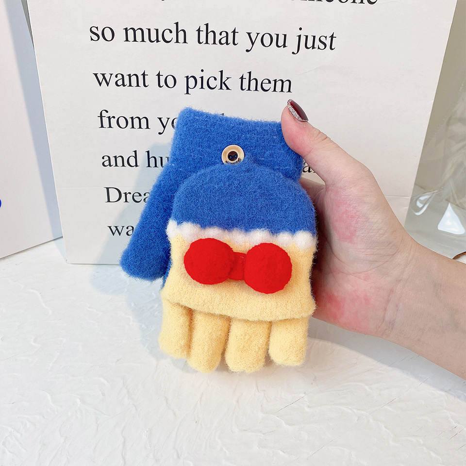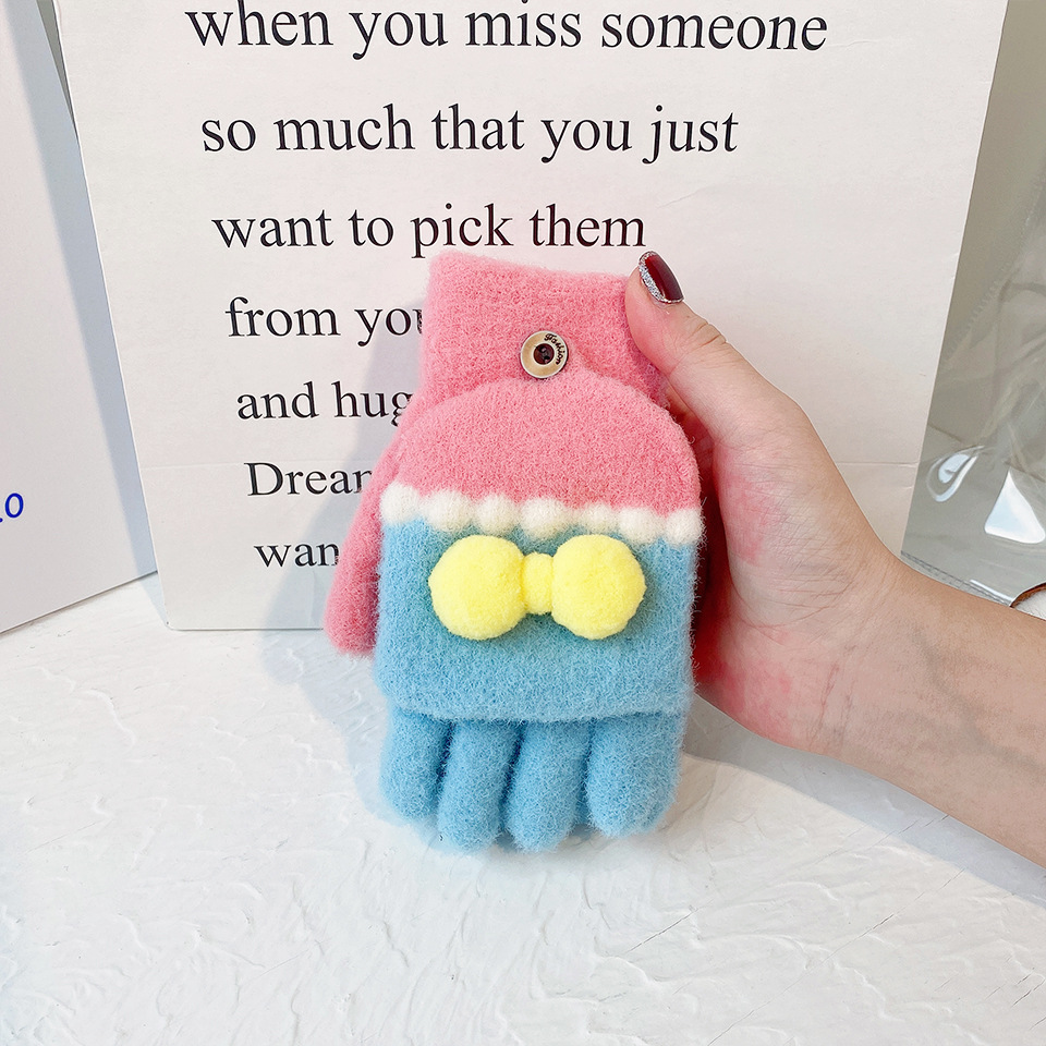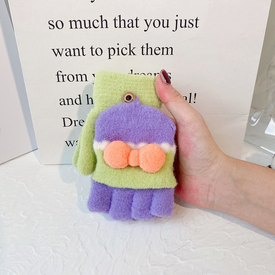 소녀를위한 한국식 만화 모직 따뜻한 장갑 겨울 학생 대비 색상 반 손가락 플립 커버 달콤한 두꺼운 방한 노출 손가락