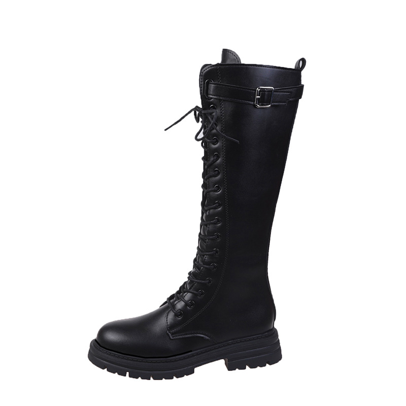 2024 가을, 겨울 여성을위한 새로운 한국 스타일 부츠 영국 스타일 프론트 레이스 업 나이트 부츠 세련된 사이드 지퍼 오토바이 가죽 부츠