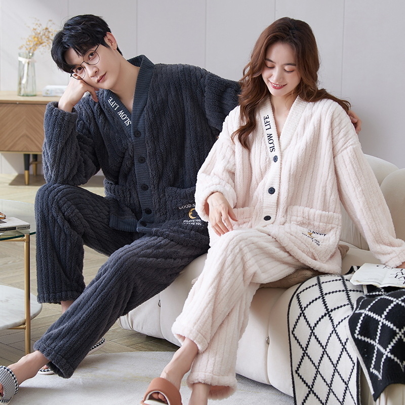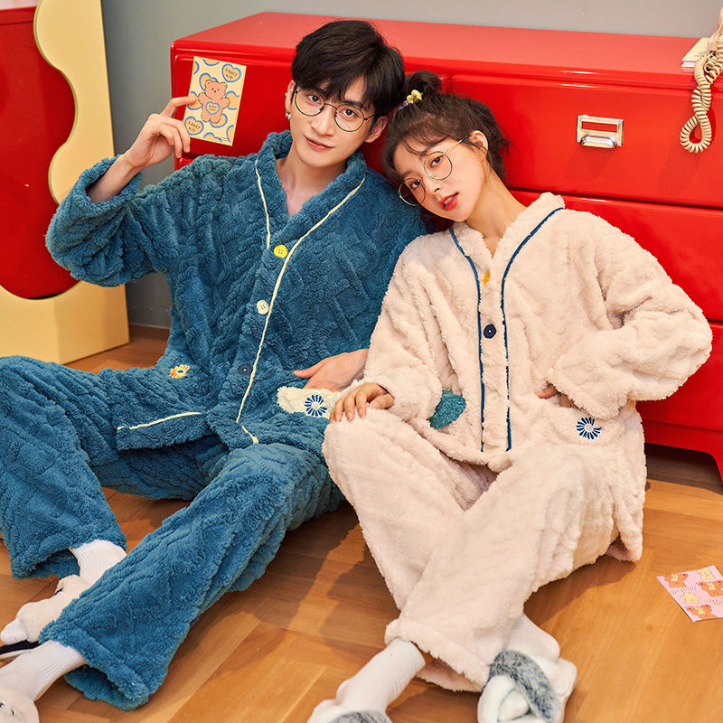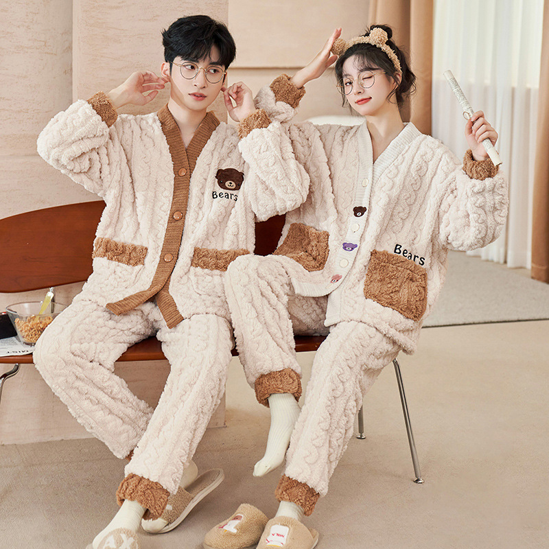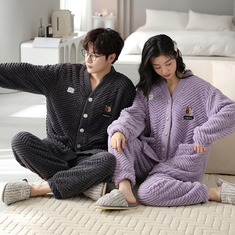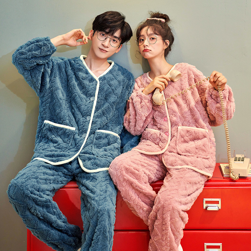 플란넬 커플 잠옷 여성의 겨울 긴 소매 세트 달콤한 귀여운 느슨한 남성 플러스 사이즈 산호 양털 홈 옷스토어 가기