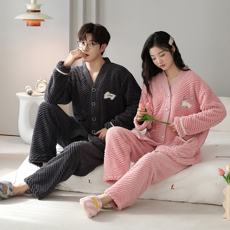 플란넬 커플 잠옷 여성의 겨울 긴 소매 세트 달콤한 귀여운 느슨한 남성 플러스 사이즈 산호 양털 홈 옷