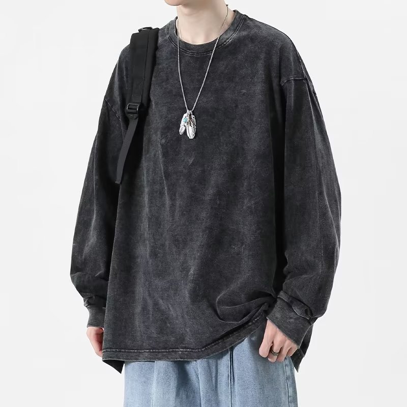 아메리칸 스타일 빈티지 워싱 디스트레스드 긴팔 티셔츠 남성용 2022 봄과 가을 라운드 넥 느슨한 유럽과 미국의 하이 스트리트 트렌디 솔리드 컬러스토어 가기