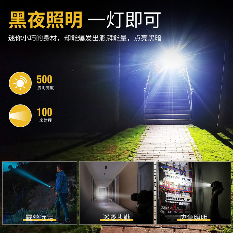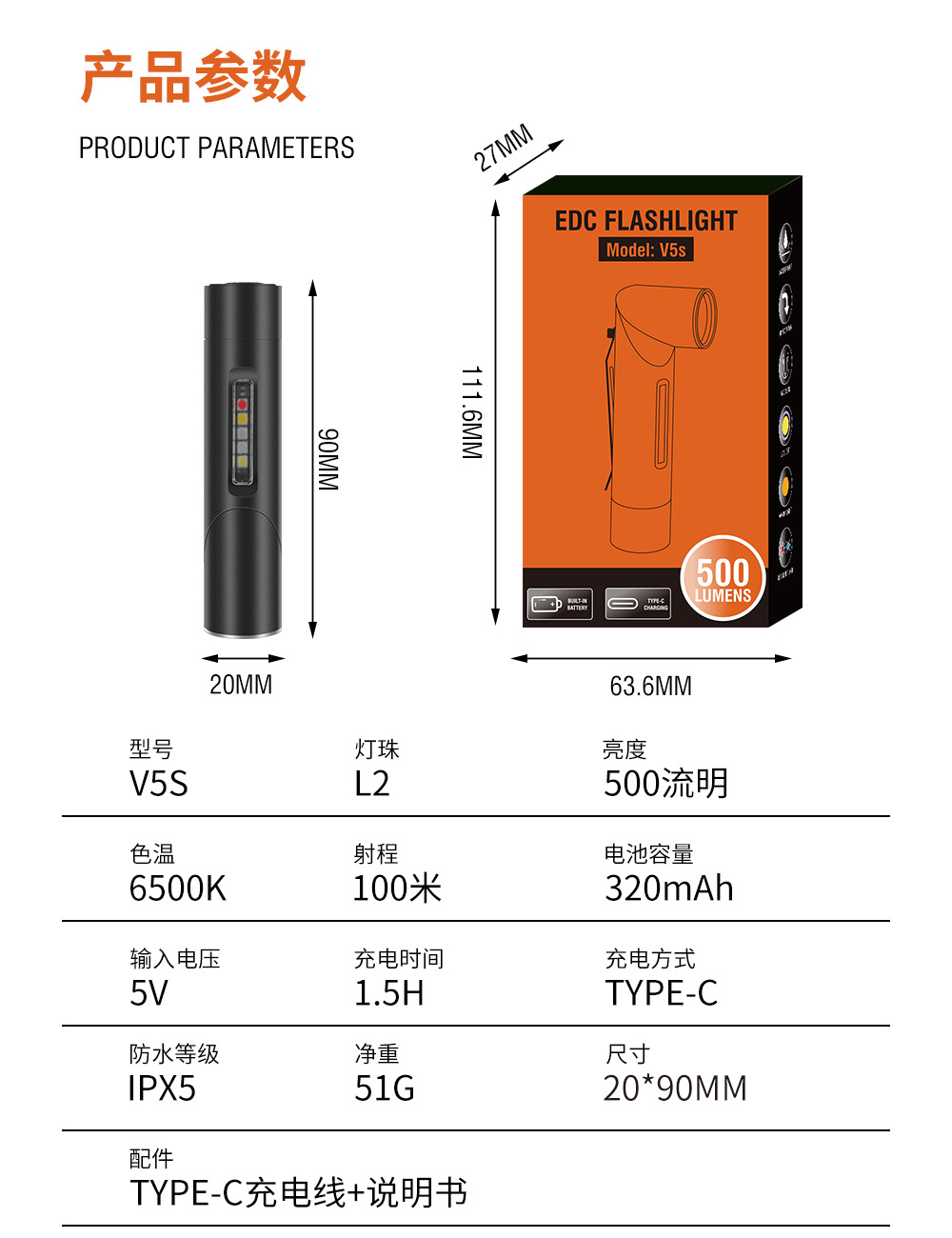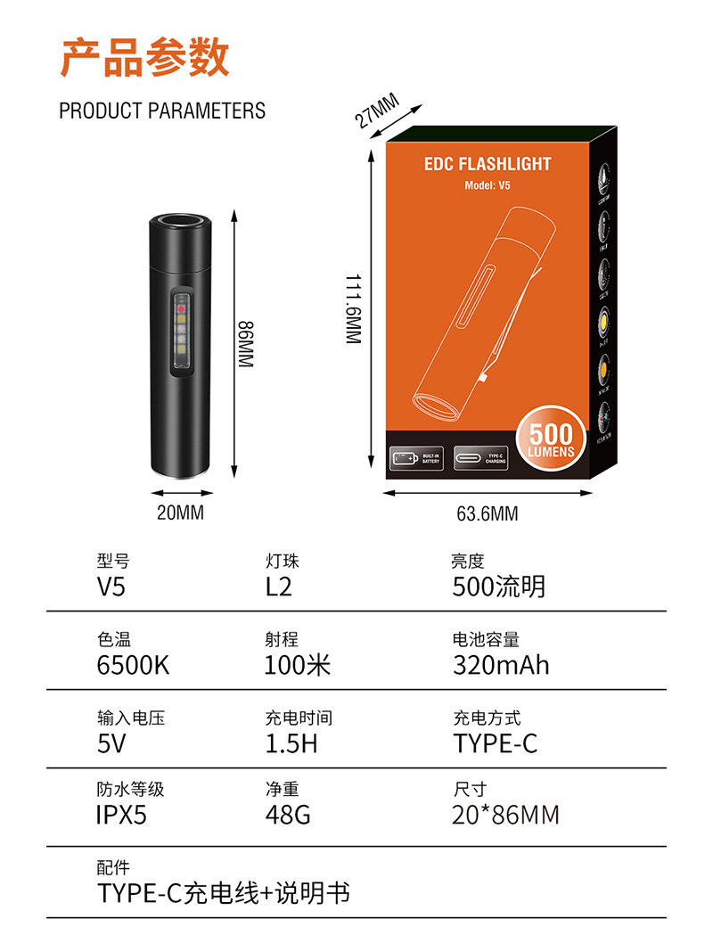 包装清单:手电筒,USB线,说明书,包装盒