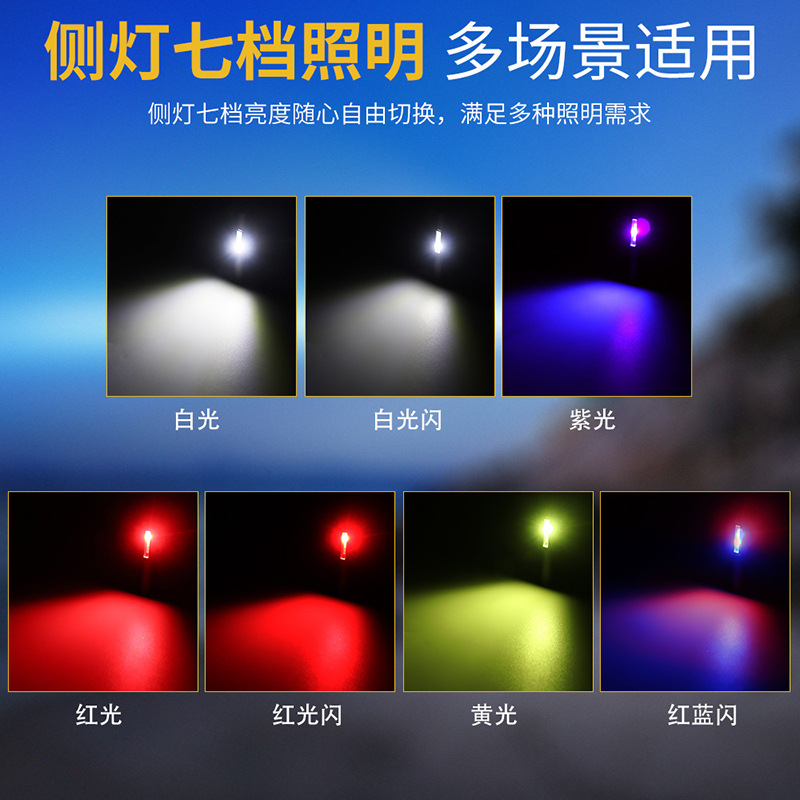 侧灯工作模式:三击开启:白光-白光闪-紫光-红光-红光闪-黄光-红蓝闪,长按关闭。