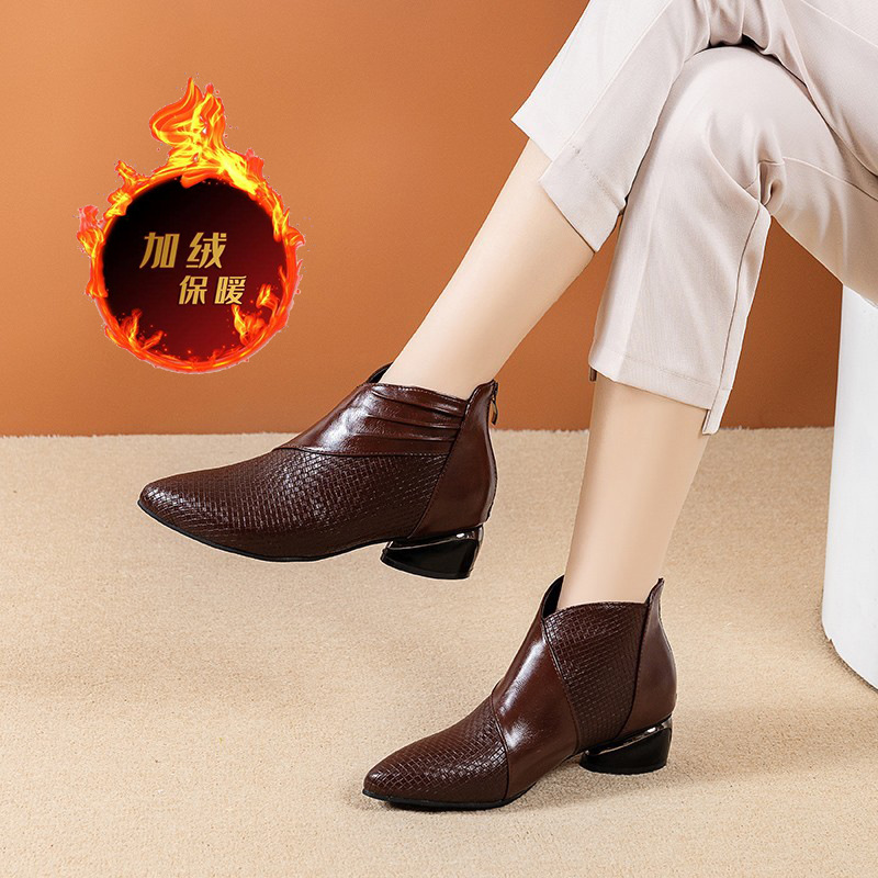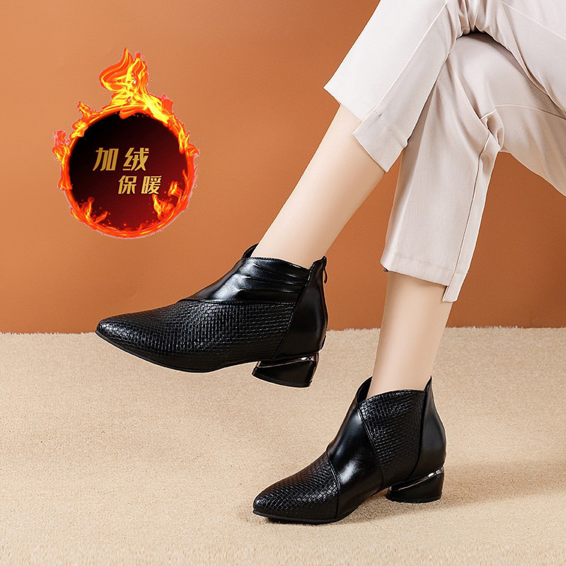 여성용 짧은 부츠 두꺼운 굽 2025 봄 겨울 신상 중간 굽 뒷 지퍼 여성용 뾰족한 가죽 부츠 플러스 벨벳 고급 여성용 부츠스토어 가기