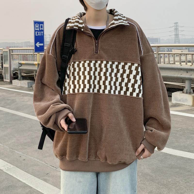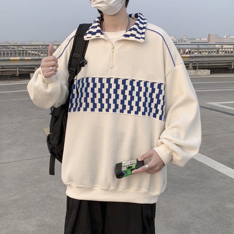 빈티지 컬러 블록 와플 스웨터 남자의 봄과 가을 느슨한 하프 지퍼 라펠 폴로 셔츠 홍콩 스타일 트렌디 브랜드 캐주얼 재킷스토어 가기
