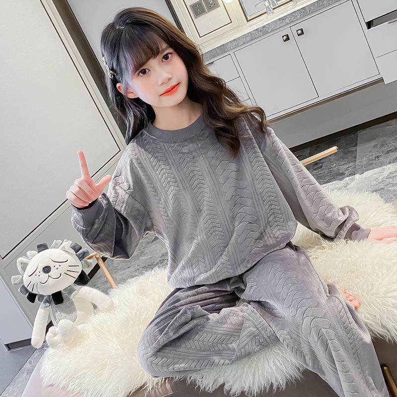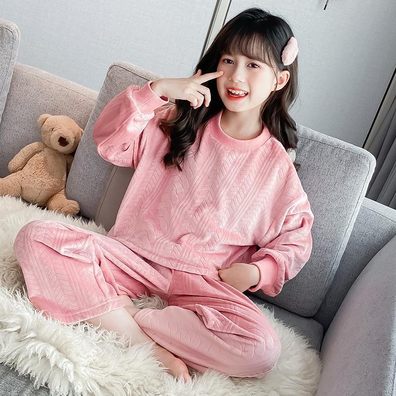 여아 단색 가정복 가을과 겨울 두꺼운 섬 벨벳 부드럽고 편안한 잠옷 바지 라운드 넥 긴팔 투피스 세트