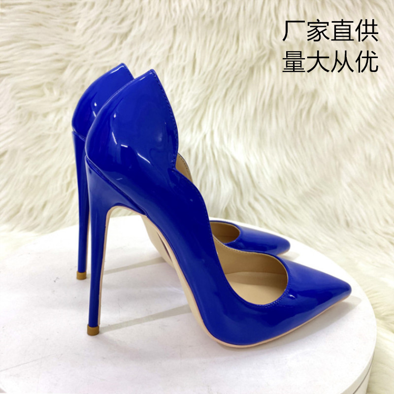 국경 간 대외 무역 도매 새로운 사파이어 블루 특허 가죽 웨이브 하이힐 12CM 뾰족한 스틸레토 로우 컷 신발 여성 신발