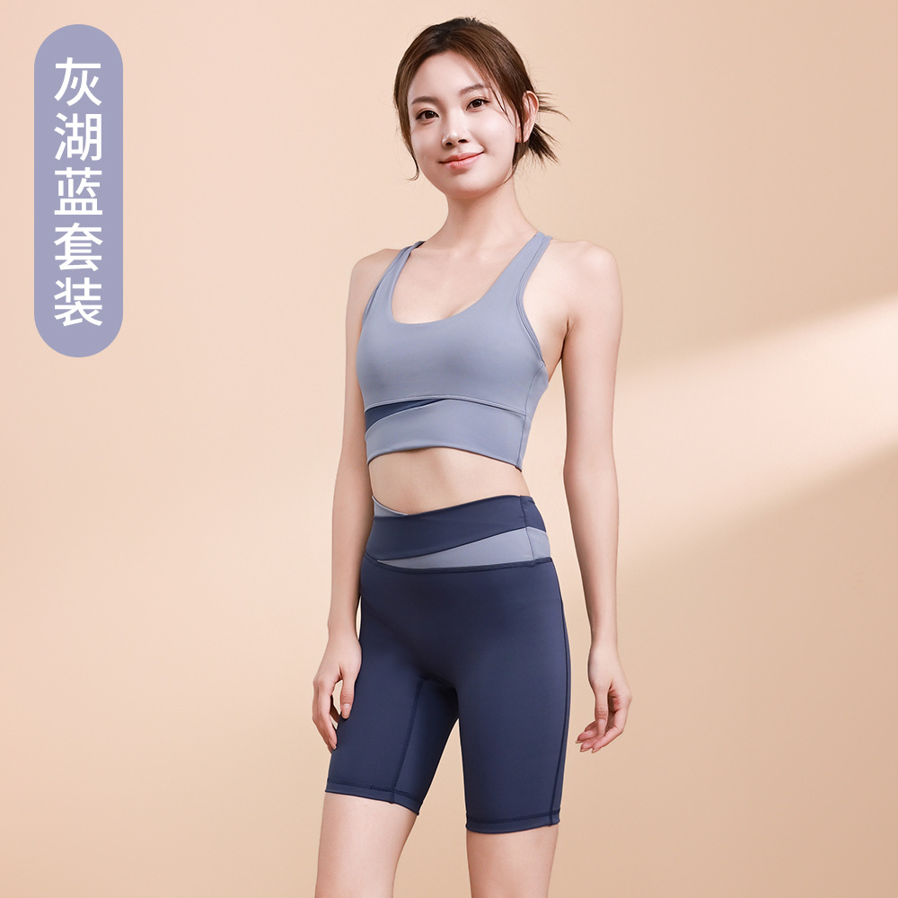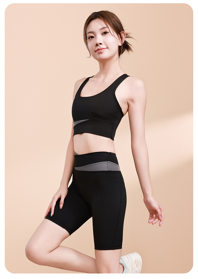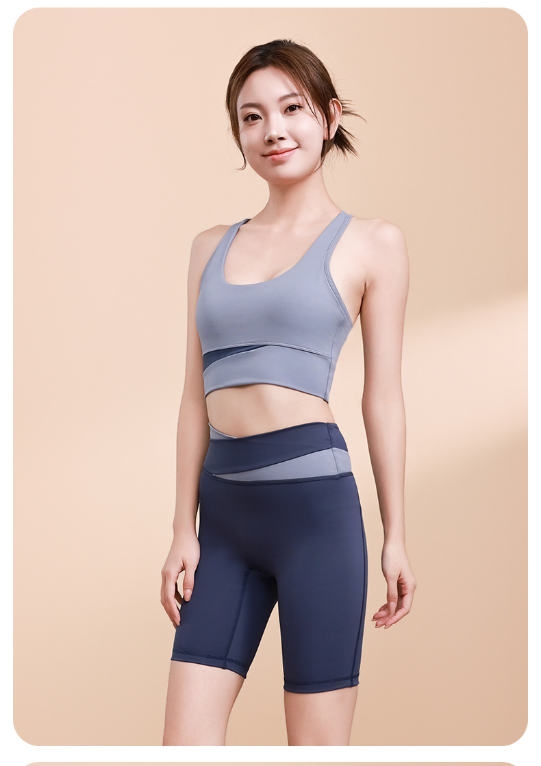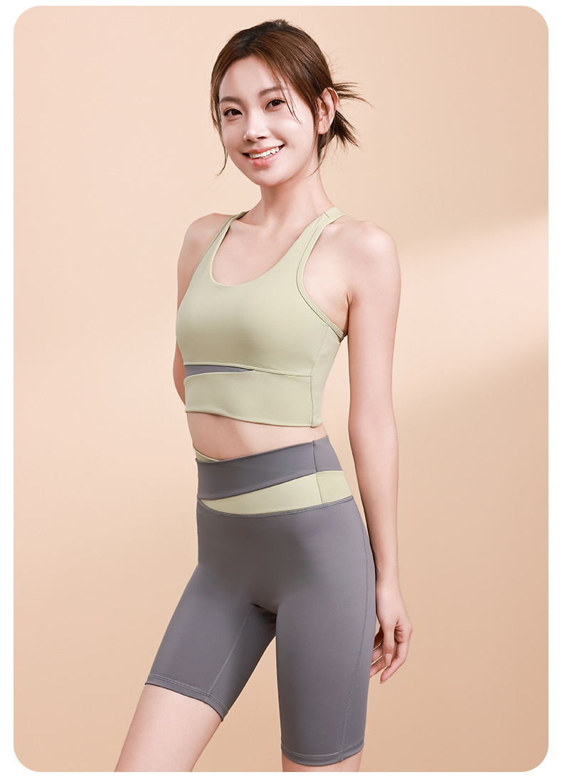 컬러 매칭 하이 웨이스트 배꼽 턱걸이 복숭아 엉덩이 배꼽 노출 요가 의류 반바지 세트 충격 방지 수집 허리 보호 다리 슬리밍 피트니스 브라