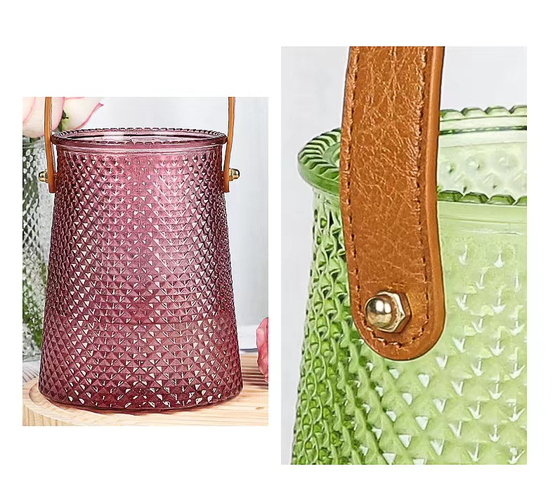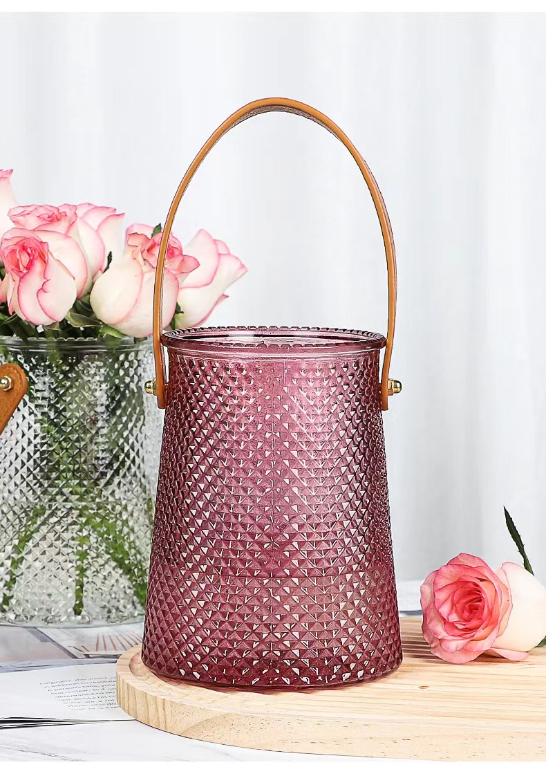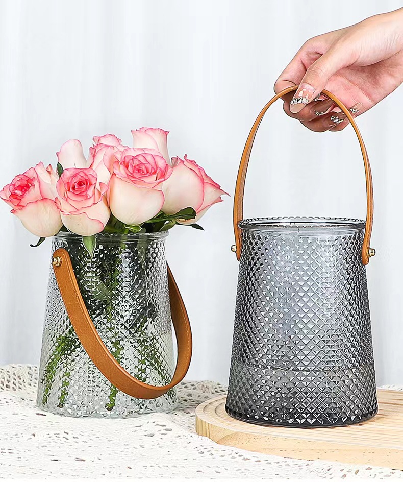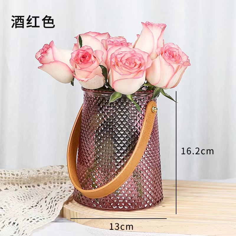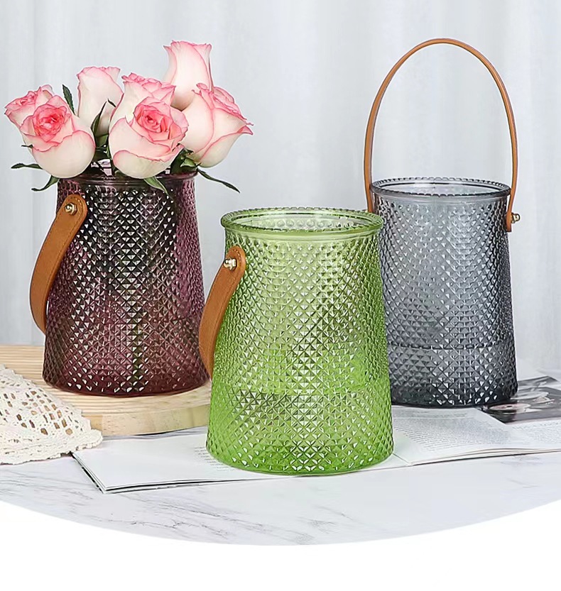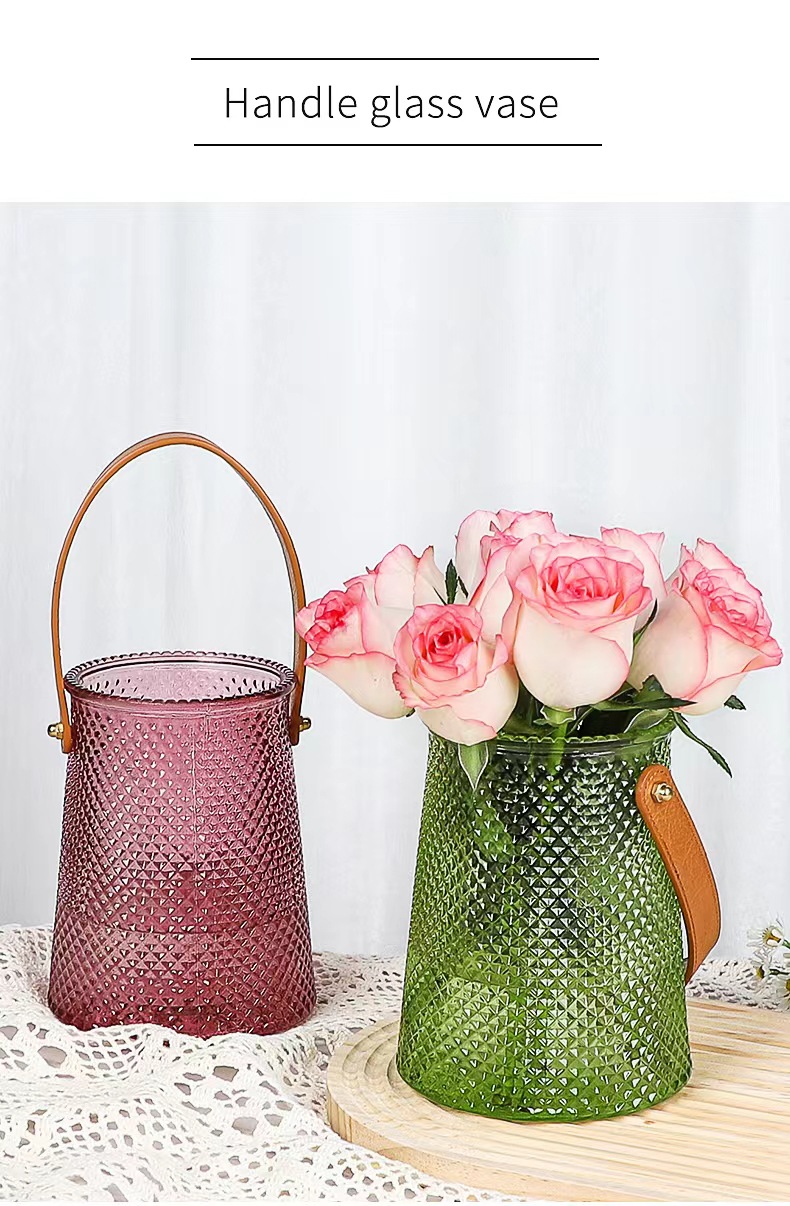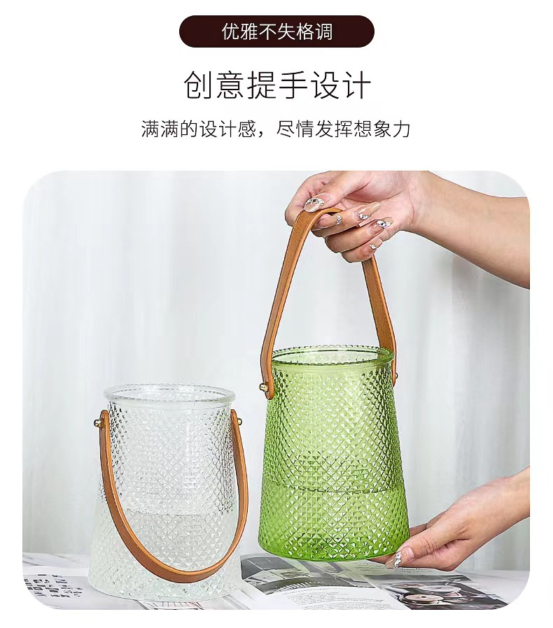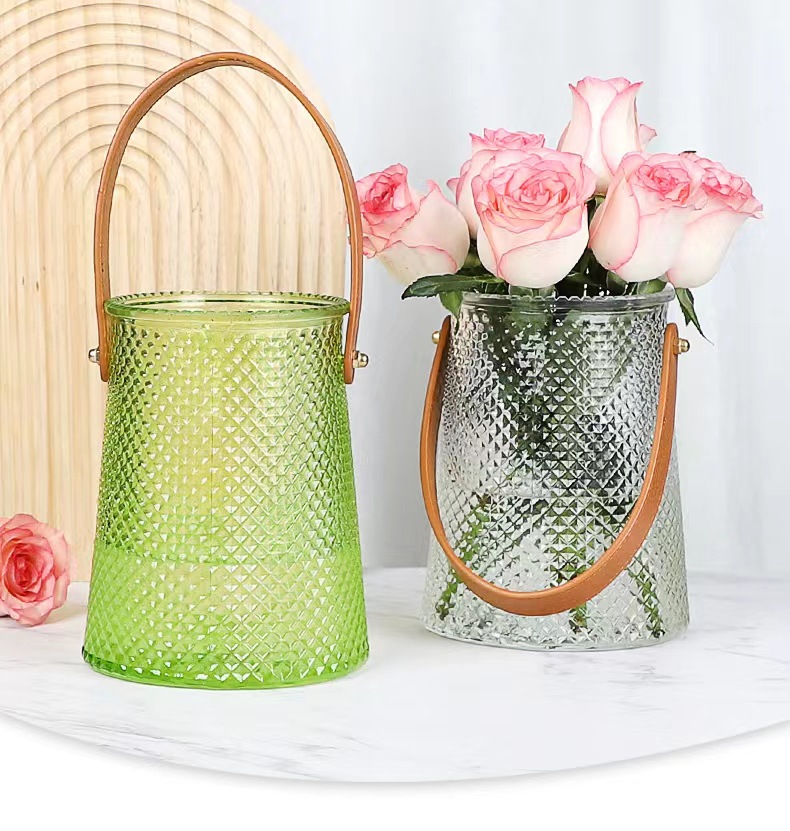 북유럽풍 인스 스타일 라이트 럭셔리 레이스 핸드백 유리 꽃병 녹색 덩굴 꽃꽂이 조합 유리 꽃병 도매