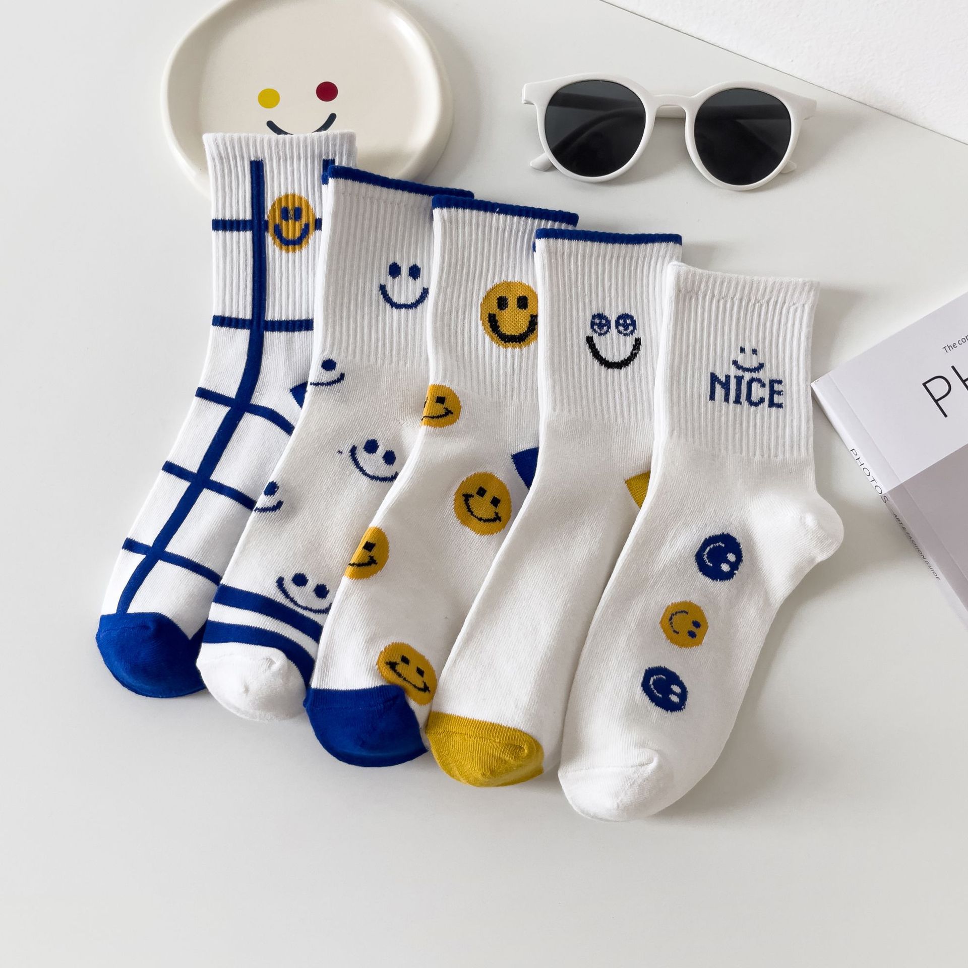 파란색과 흰색 웃는 양말 여성 중간 길이의 양말 Ins 유행 간단한 한국 스타일 봄과 가을 땀 흡수 통기성 스타킹 독특한 코튼 양말스토어 가기