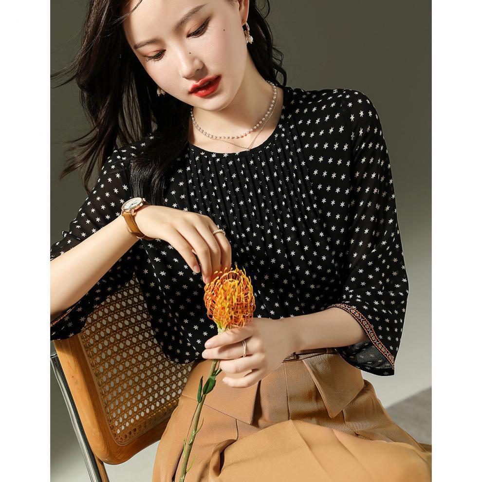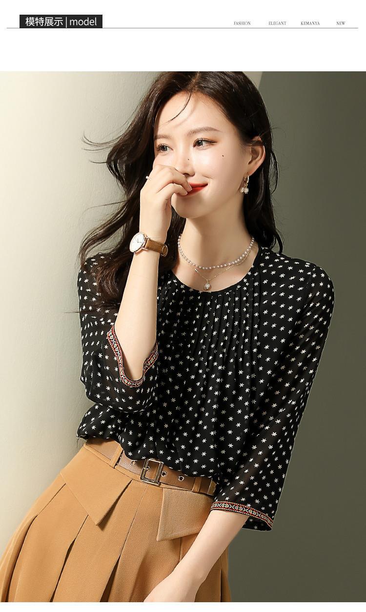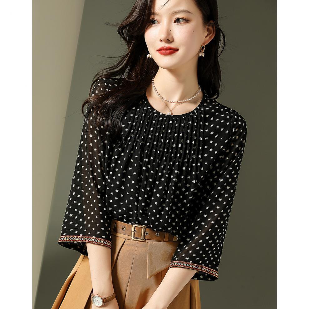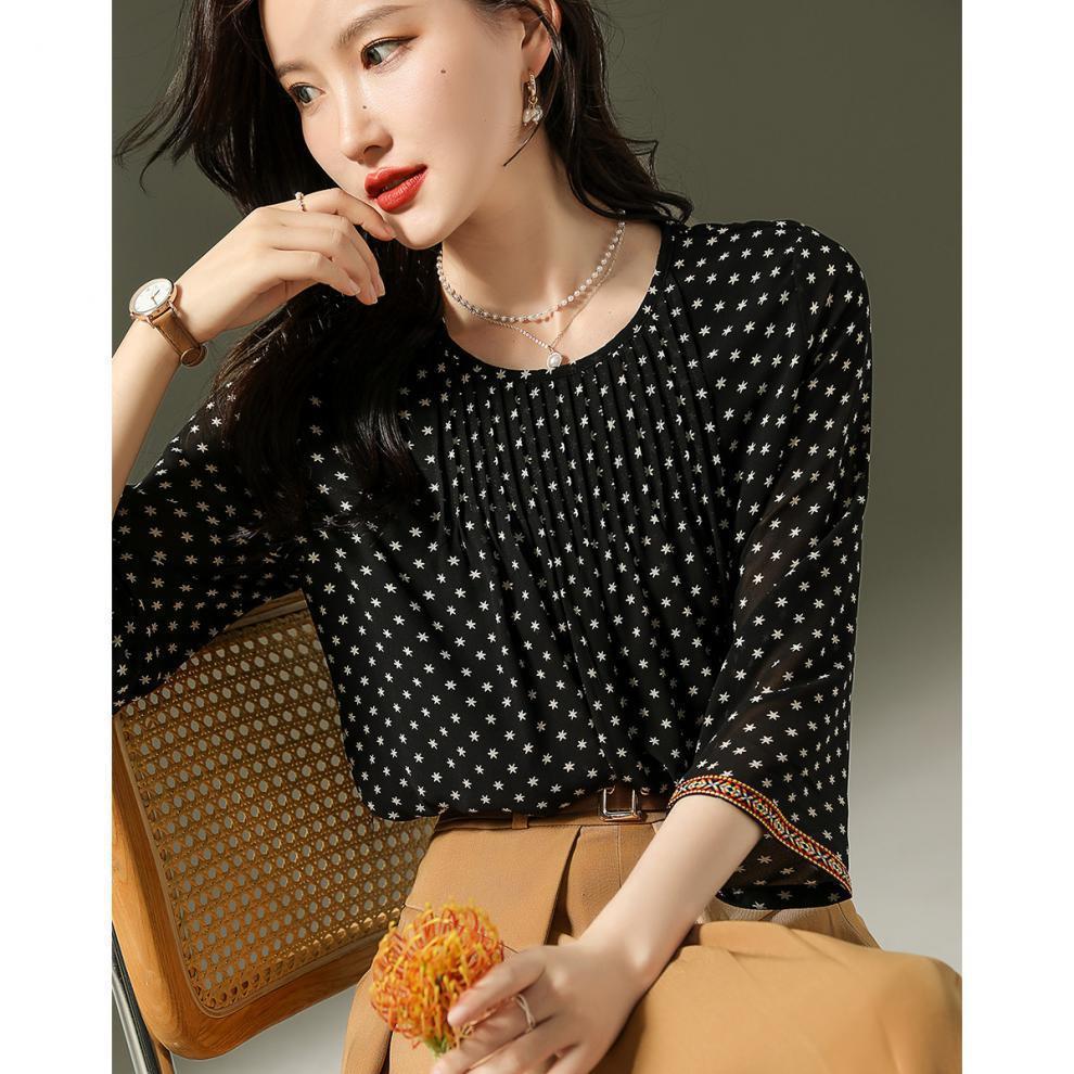 인쇄 된 쉬폰 셔츠 둥근 목 간단한 우아한 통근 패션 우아한 새로운 작은 셔츠 여성 긴 소매 가을스토어 가기