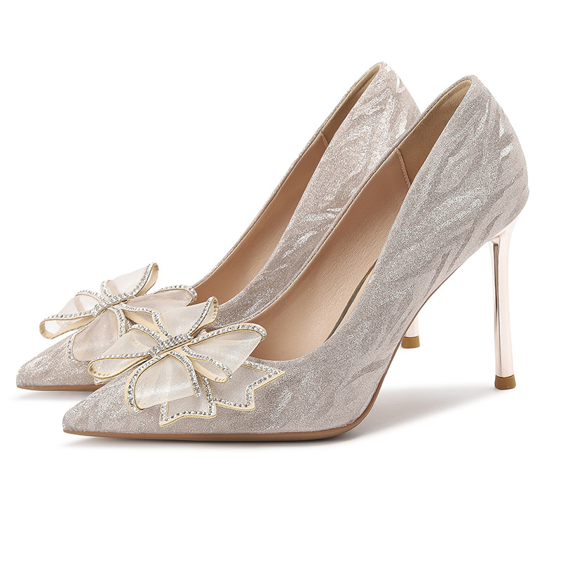 2025년 가을 신상 프렌치 스타일 하이힐 실버 웨딩 슈즈 슬림 힐 뾰족코 작은 사이즈 신부 구두 리본 단화