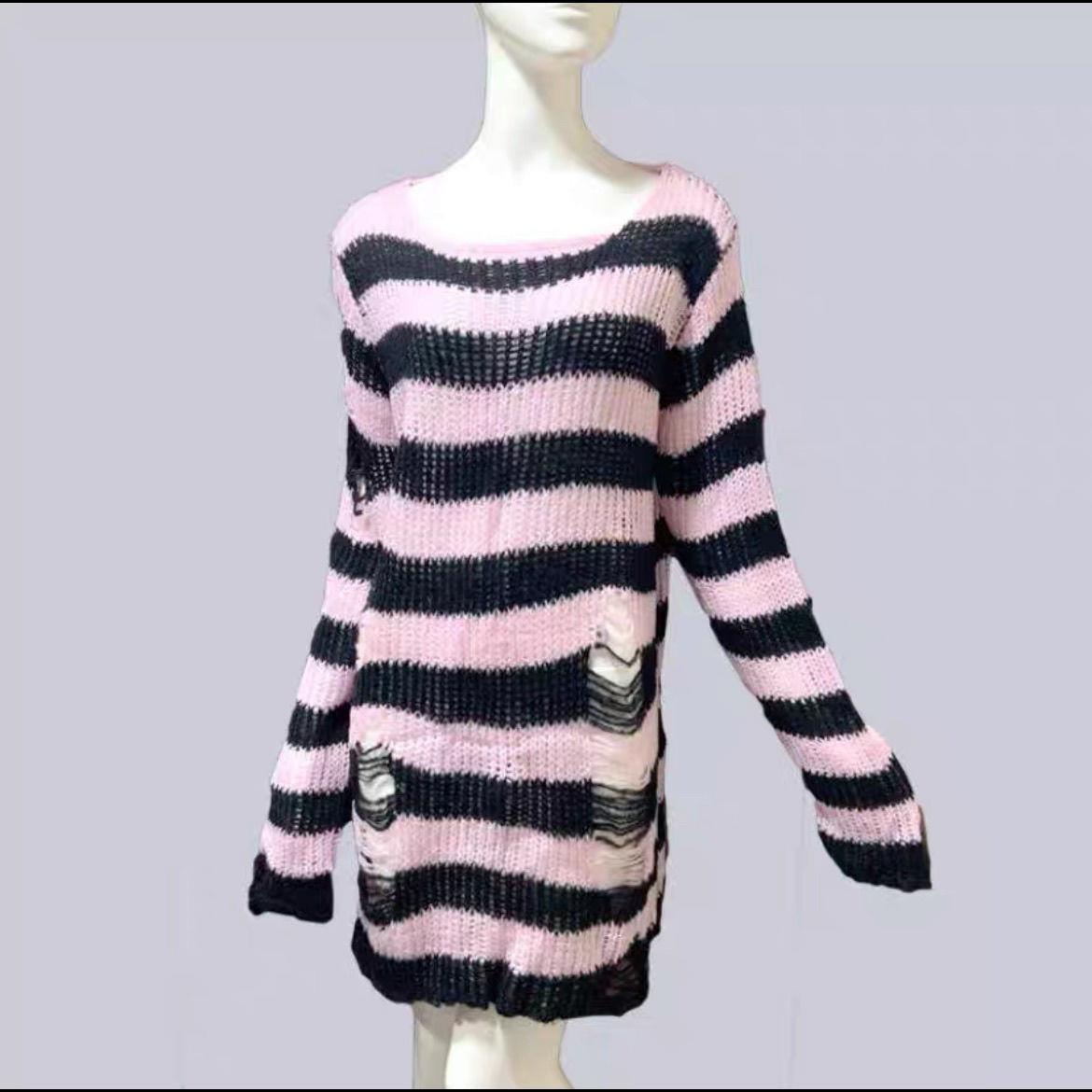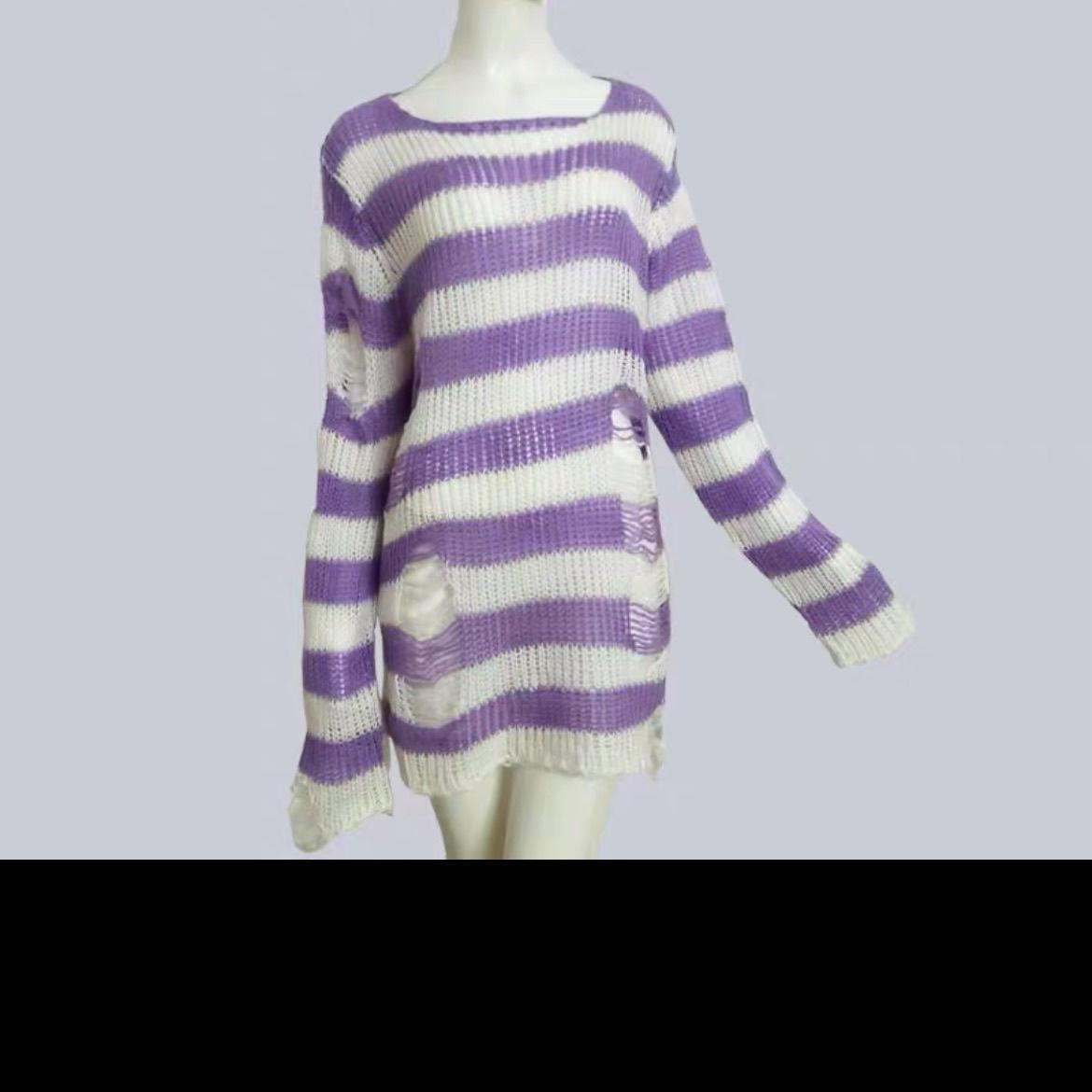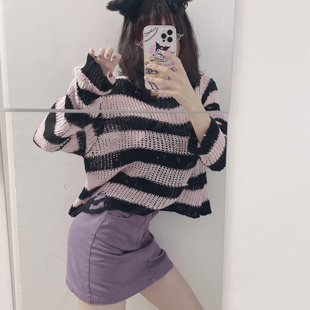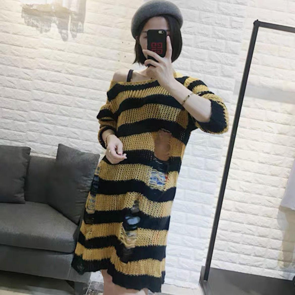 한국식 홀 중공 미디 스웨터 여성용 커플 스트라이프 느슨한 인터 컬러 다크 모든 매치 니트 의류 틈새스토어 가기