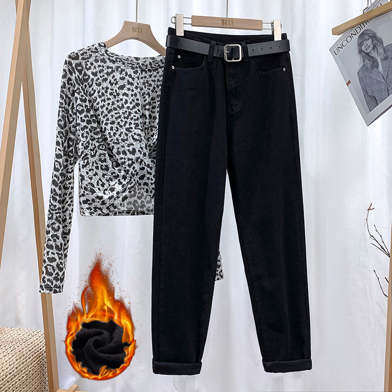 기모 청바지 여자의 느슨한 하이 웨이스트 Harlan 스트레이트 슬림 핏 두꺼운 따뜻한 자른 당근 바지