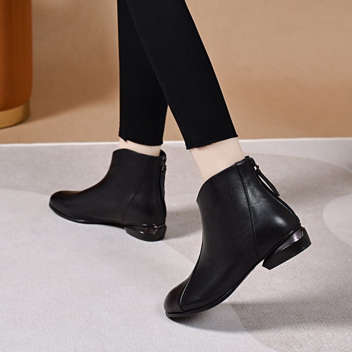 여성용 낮은 굽 가죽 부츠 2025 가을 겨울 신상 라운드 토 두꺼운 굽 면 부츠 천연 소가죽 뒷지퍼 플랫 여성용 숏부츠
