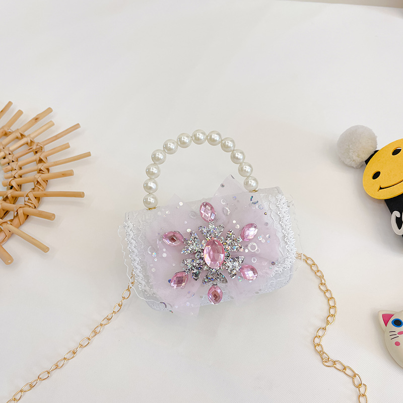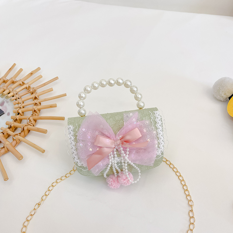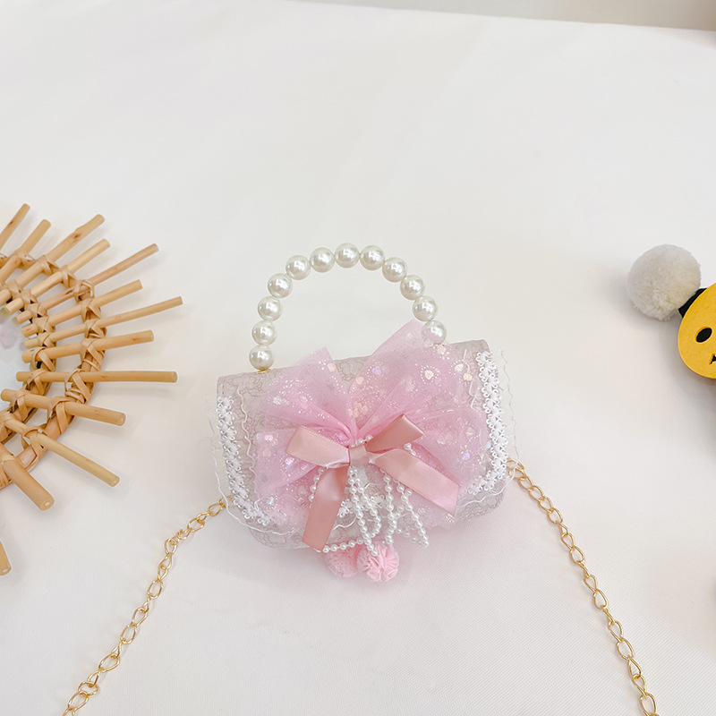새로운 어린이 가방 패션 진주 핸드백 만화 귀여운 활 어깨 가방 체인 크로스 바디 작은 가방