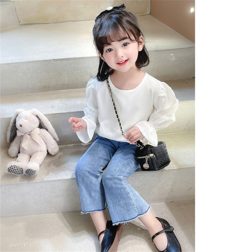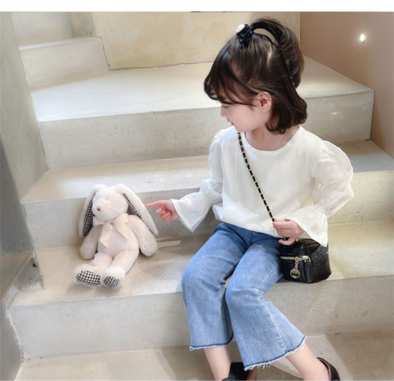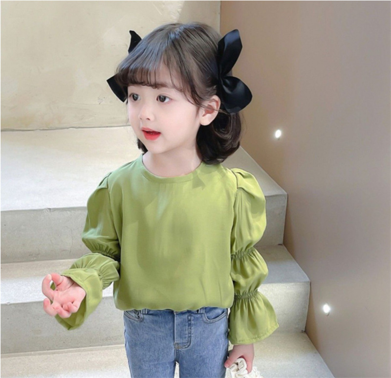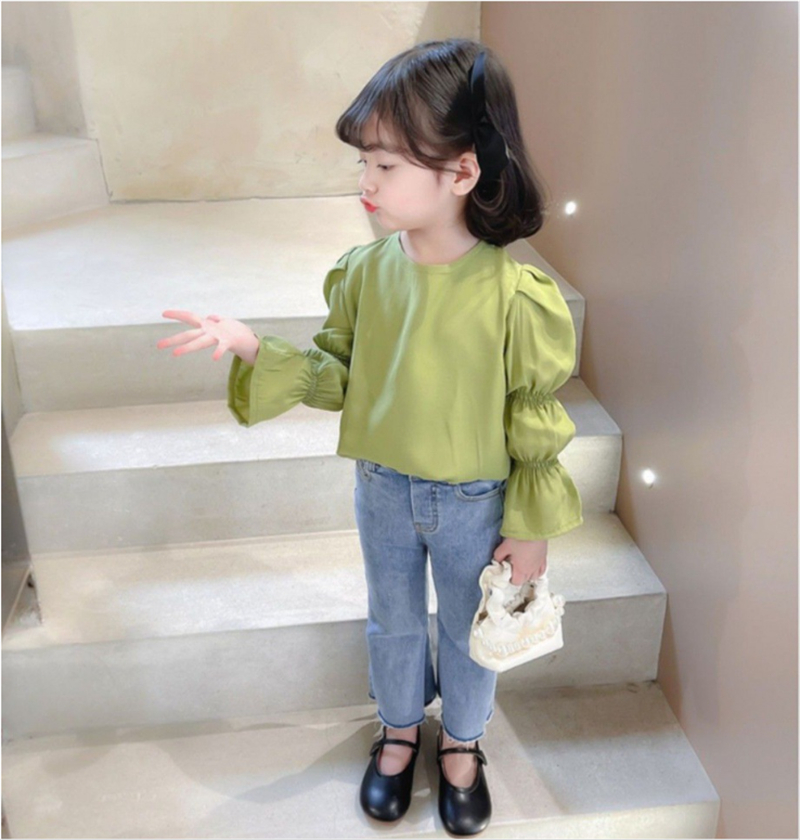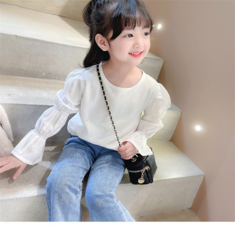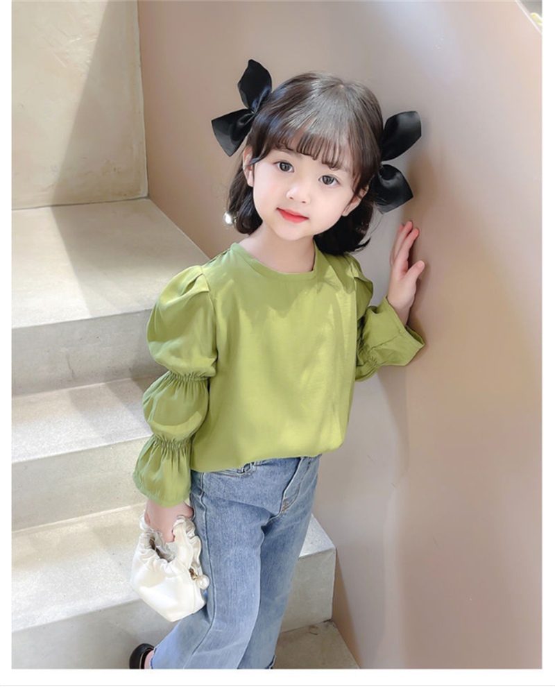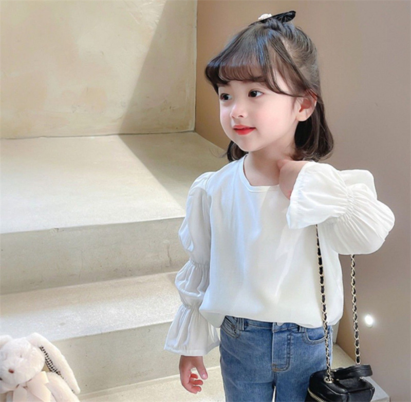 여자 라운드 넥 셔츠 긴 소매 2024 가을 한국 스타일 베이비 스타일 퍼프 슬리브 탑 어린이 쉬폰 인형 셔츠스토어 가기
