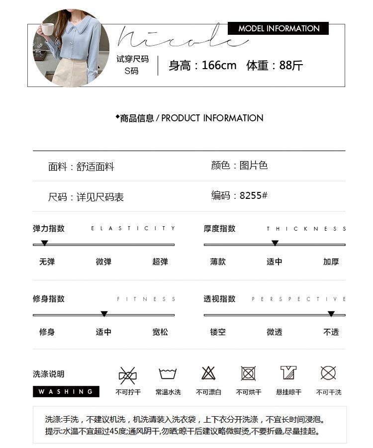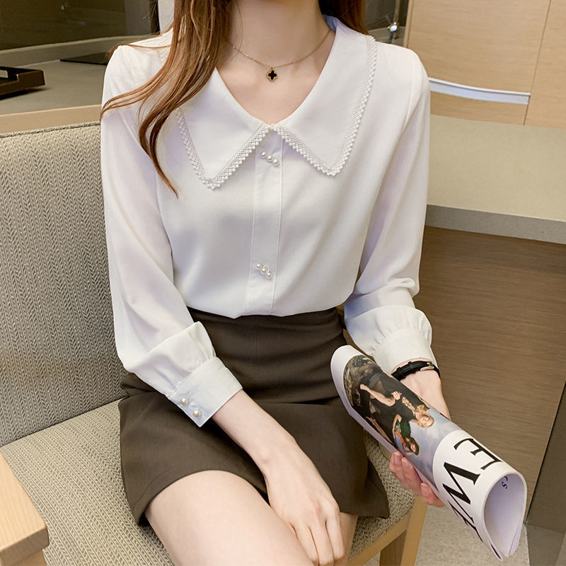 블루 셔츠 쉬폰 인형 칼라 탑 긴팔 봄과 가을 레이스 스타일리스트 나이 줄이기 셔츠 배꼽 커버링 베이스 셔츠스토어 가기