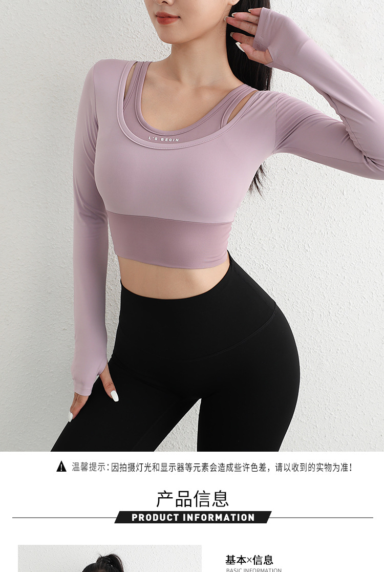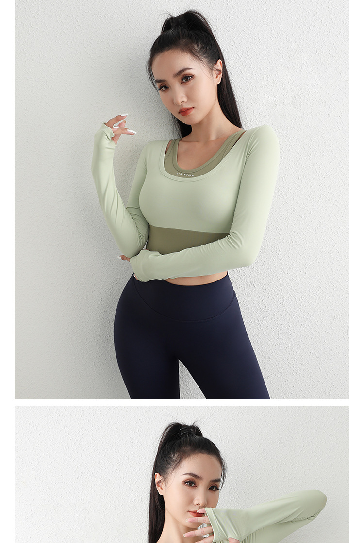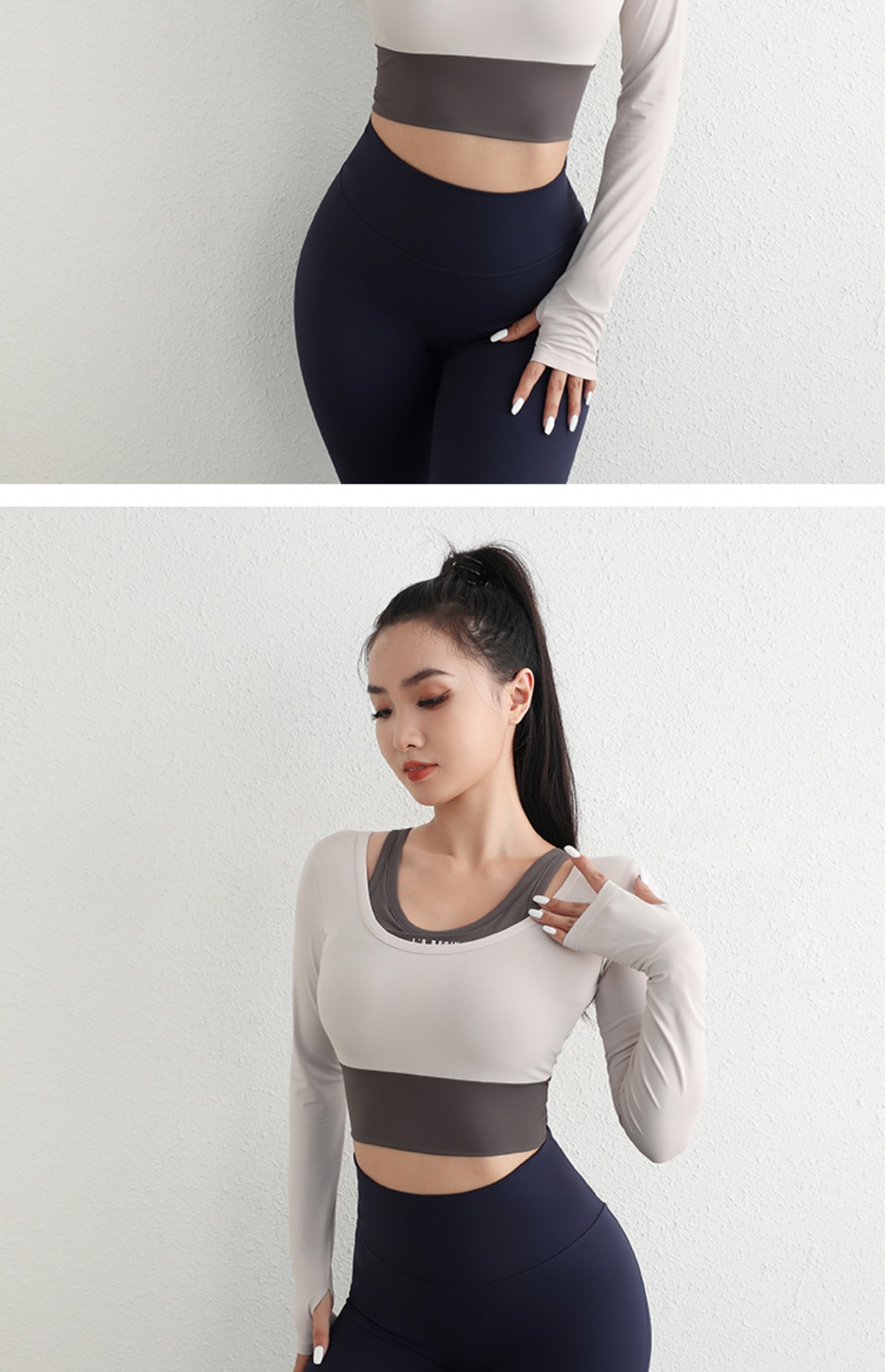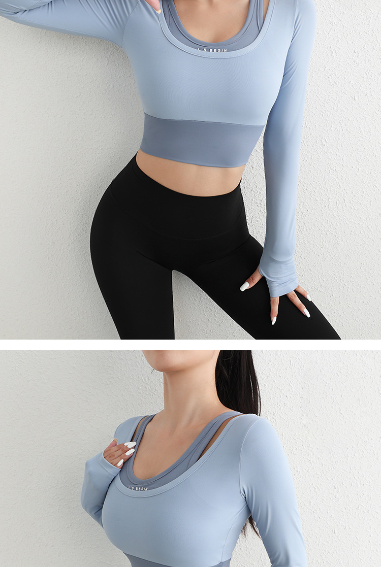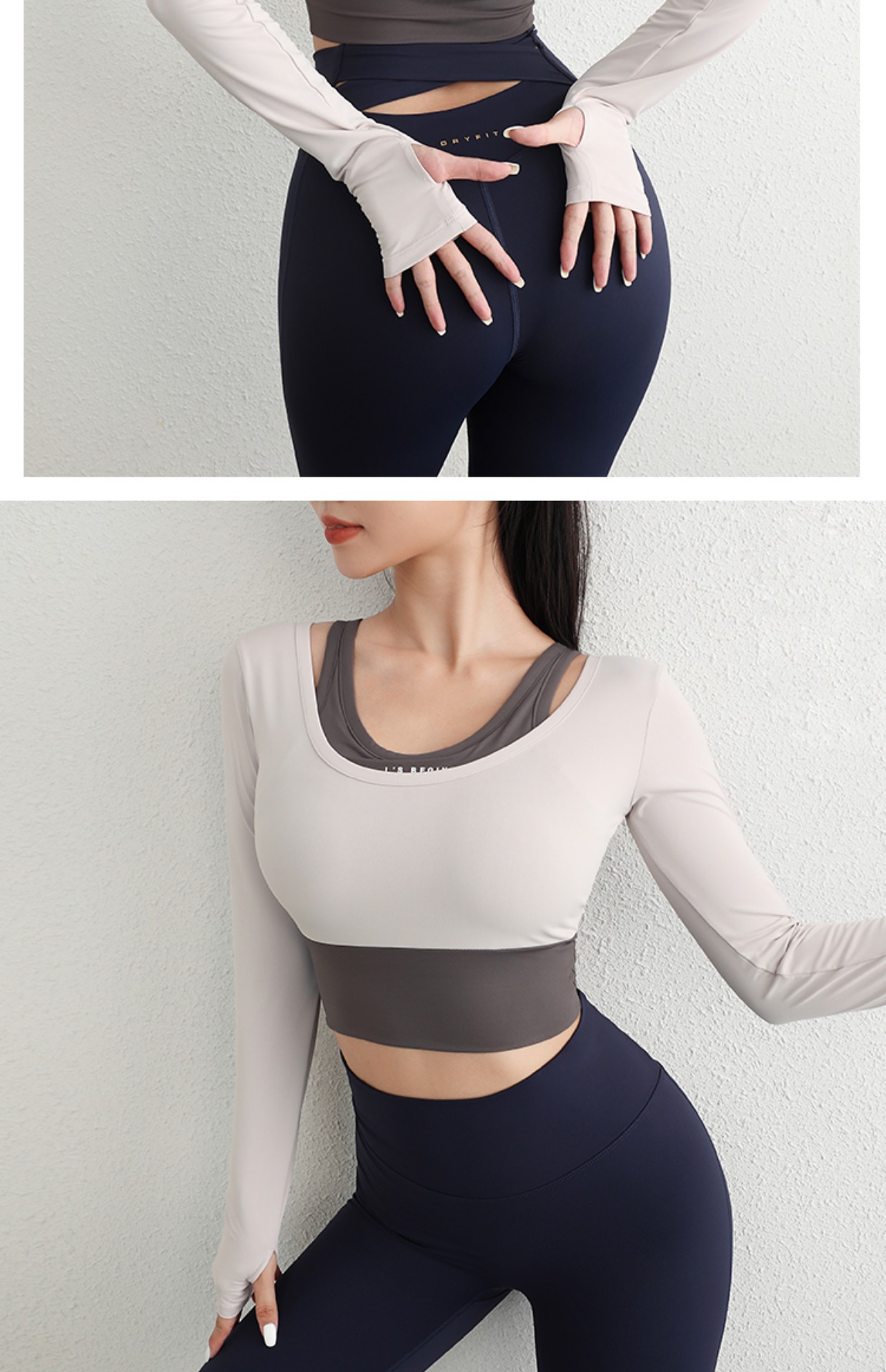 가슴 패드 피트니스와 요가 피트니스 세트 여성의 꽉 끼는 스포츠 가짜 투피스 요가 스포츠 탑 훈련 속건 긴 소매