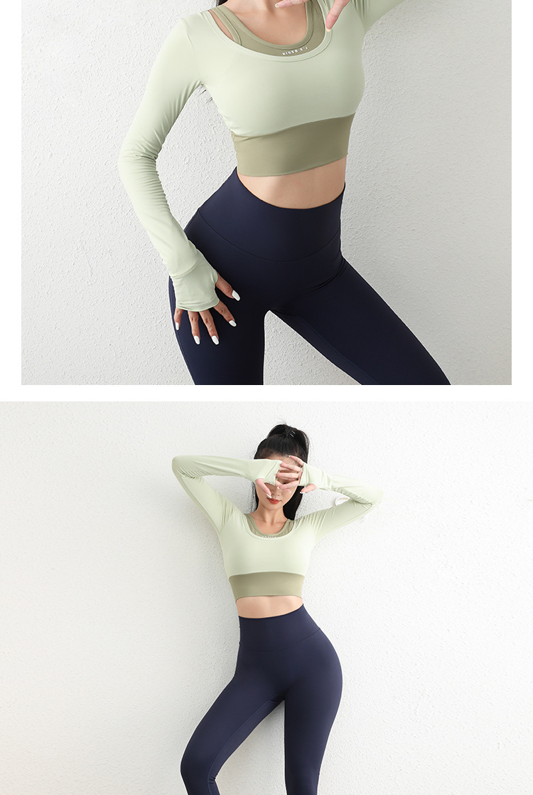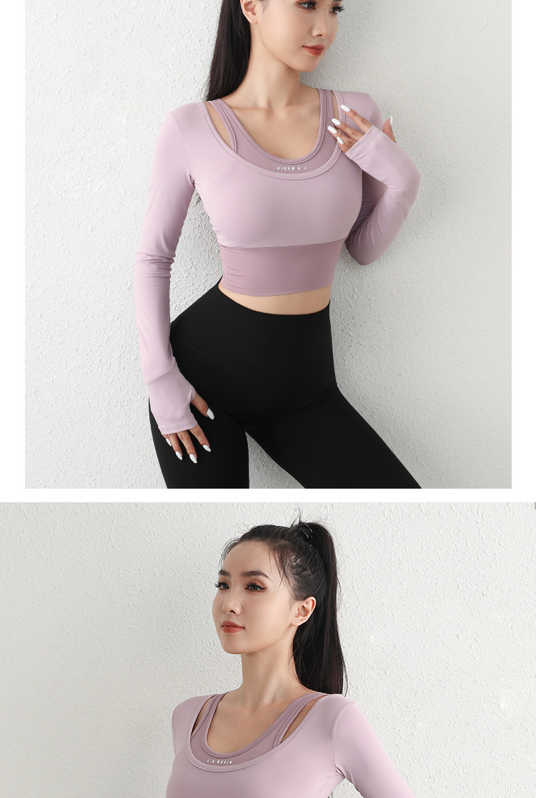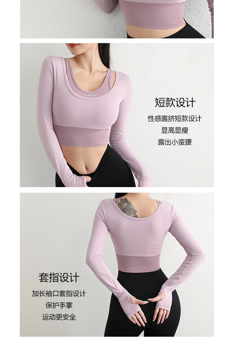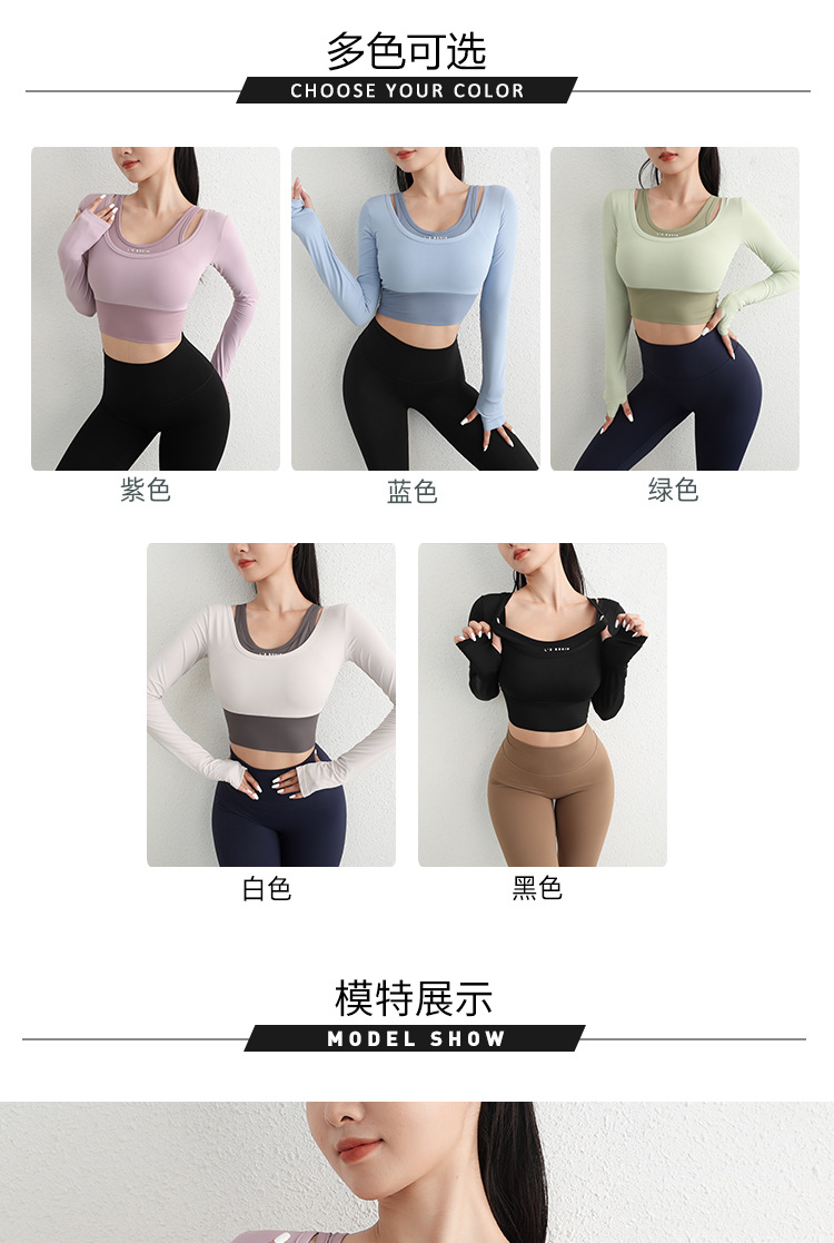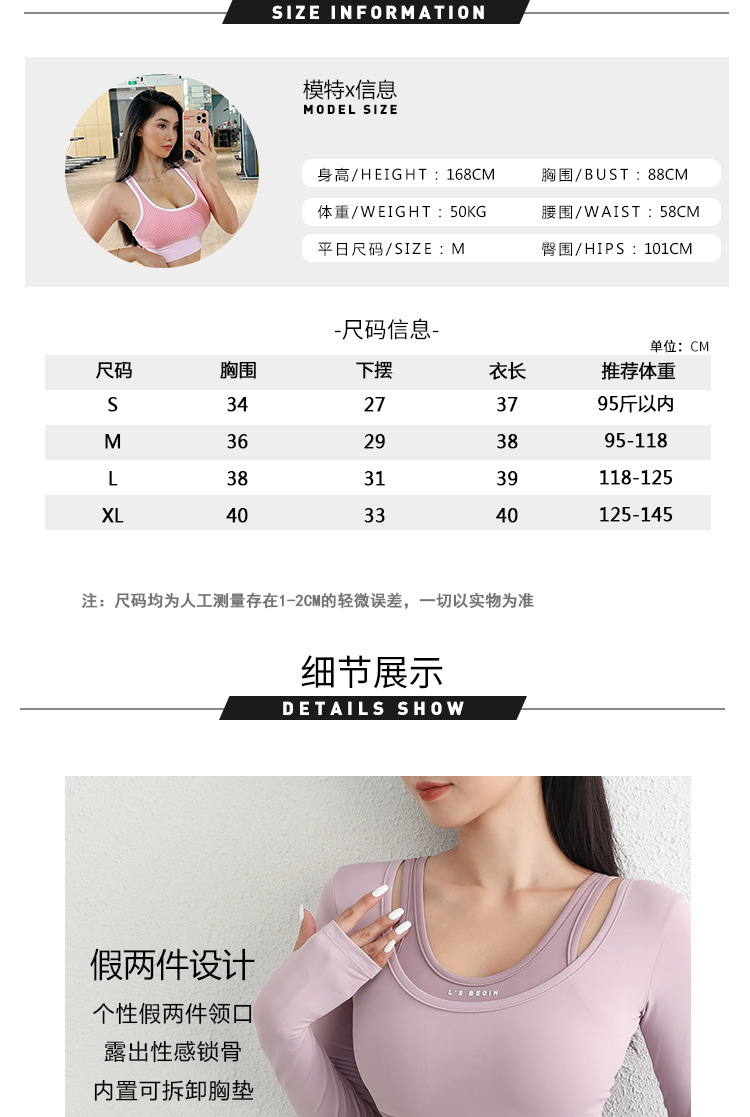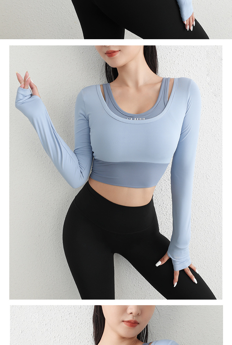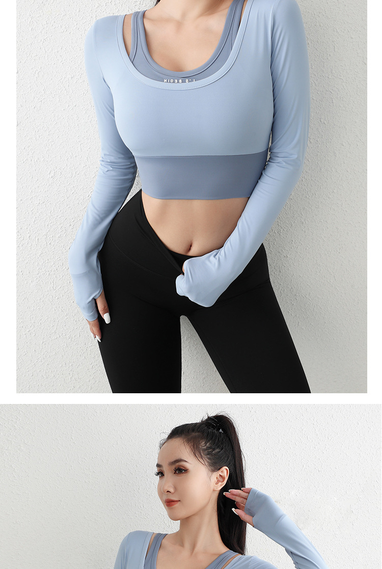 가슴 패드 피트니스와 요가 피트니스 세트 여성의 꽉 끼는 스포츠 가짜 투피스 요가 스포츠 탑 훈련 속건 긴 소매