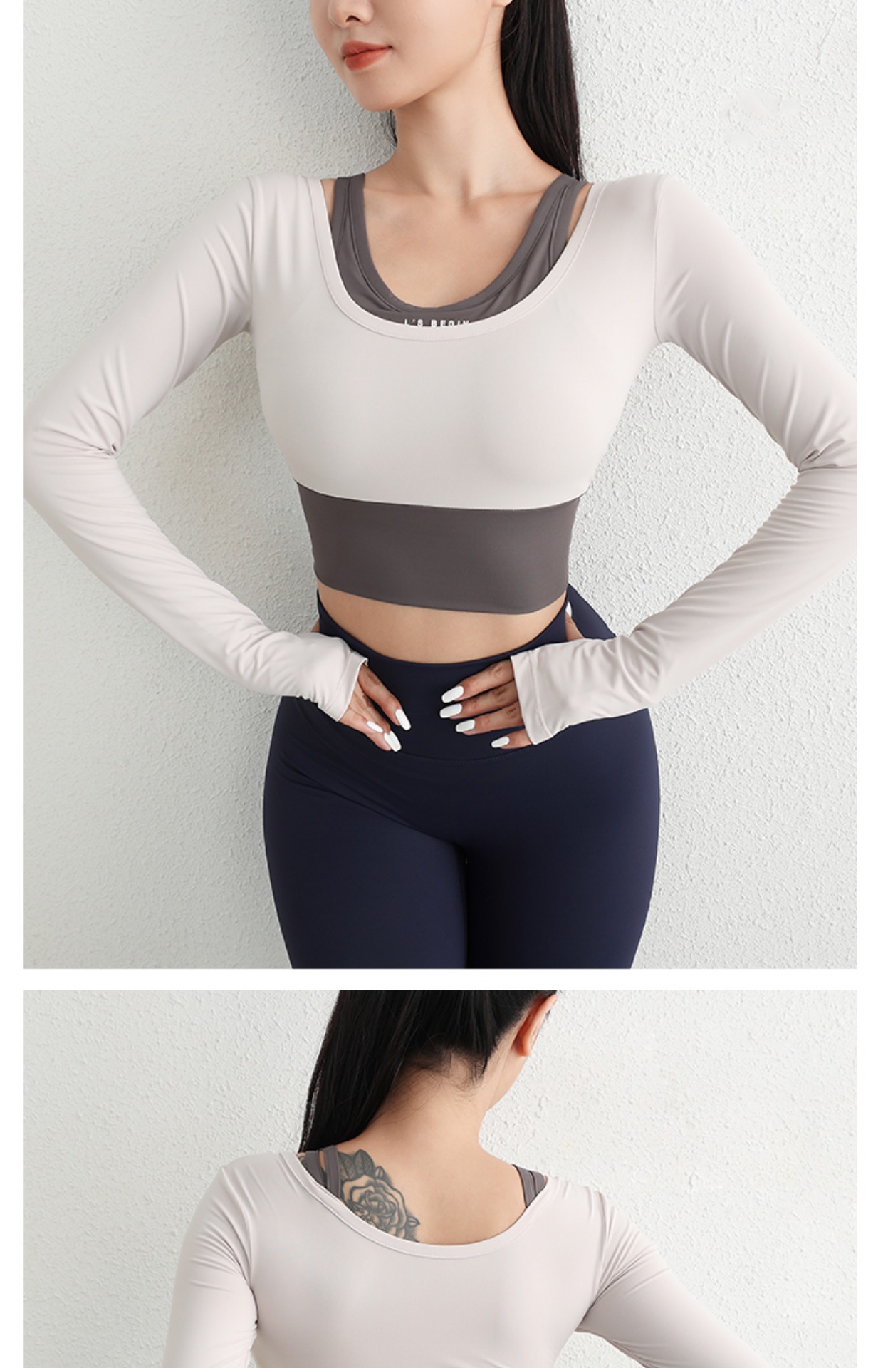 가슴 패드 피트니스와 요가 피트니스 세트 여성의 꽉 끼는 스포츠 가짜 투피스 요가 스포츠 탑 훈련 속건 긴 소매스토어 가기