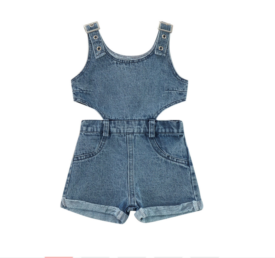 대외 무역 아동복 도매 2 색 소녀 점프 수트 여름 어린이 유럽과 미국 스타일 트렌드 민소매 데님 점프 수트 반바지스토어 가기
