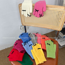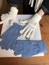 韩国新款秋冬季可爱小熊刺绣毛线针织分指五指手套触屏露指女纯色