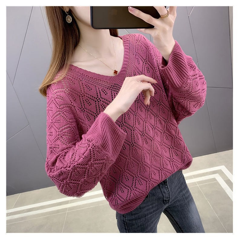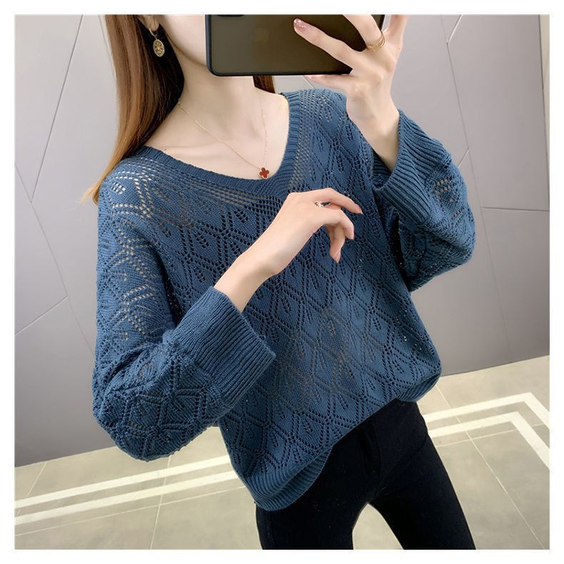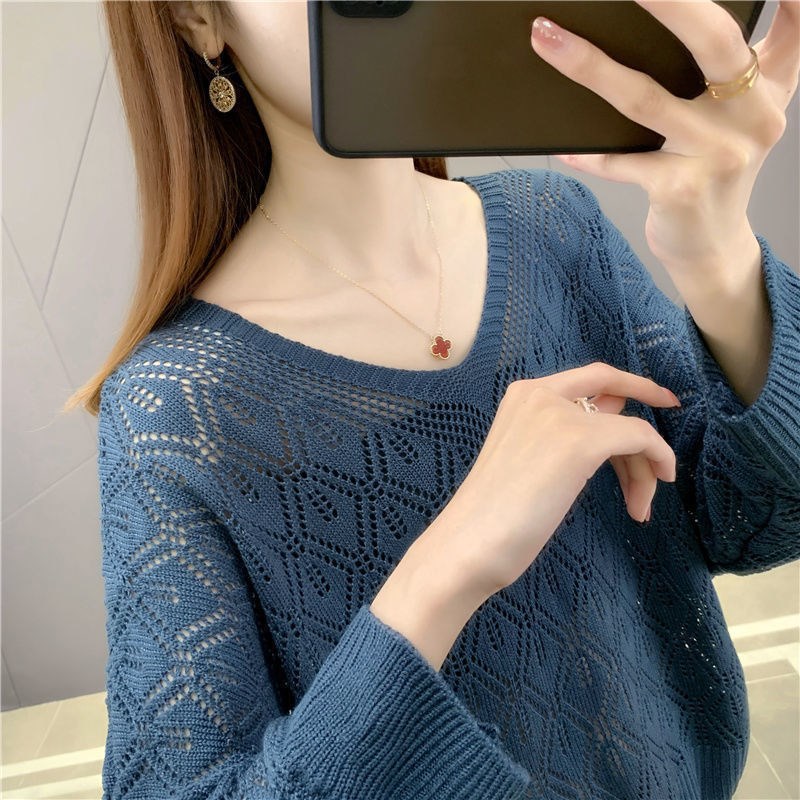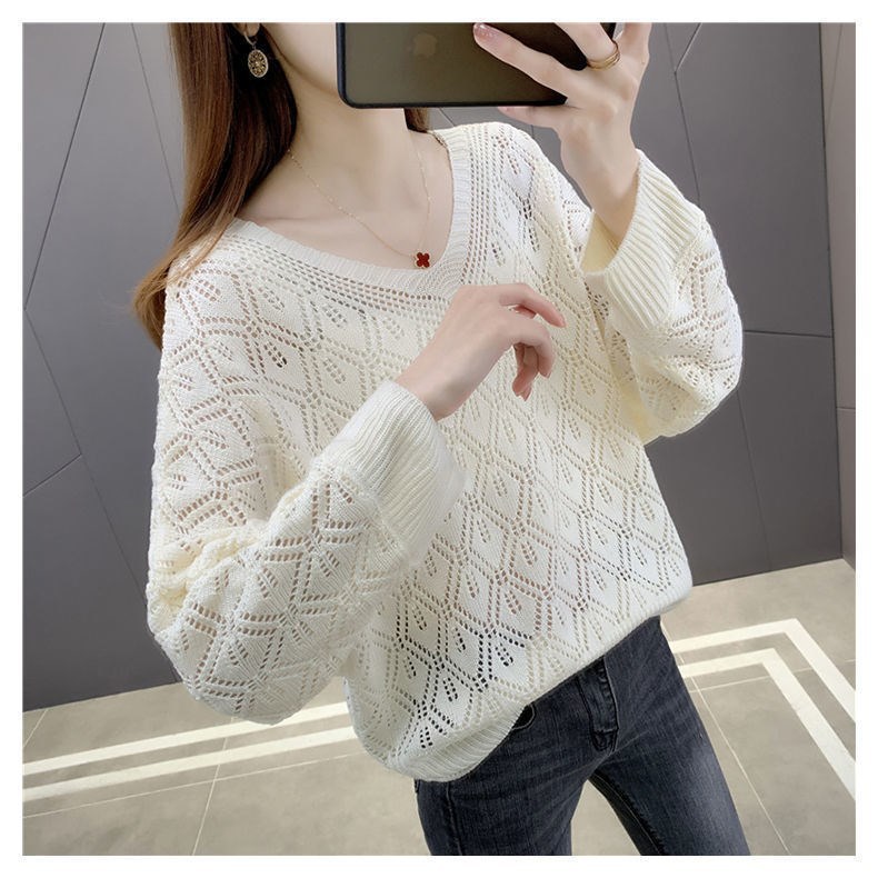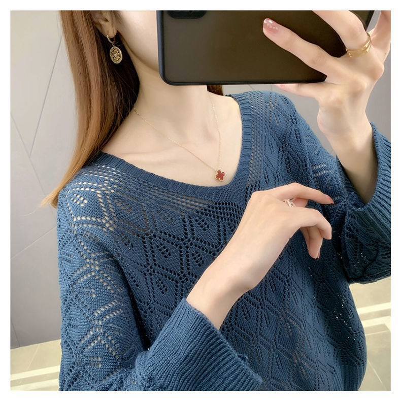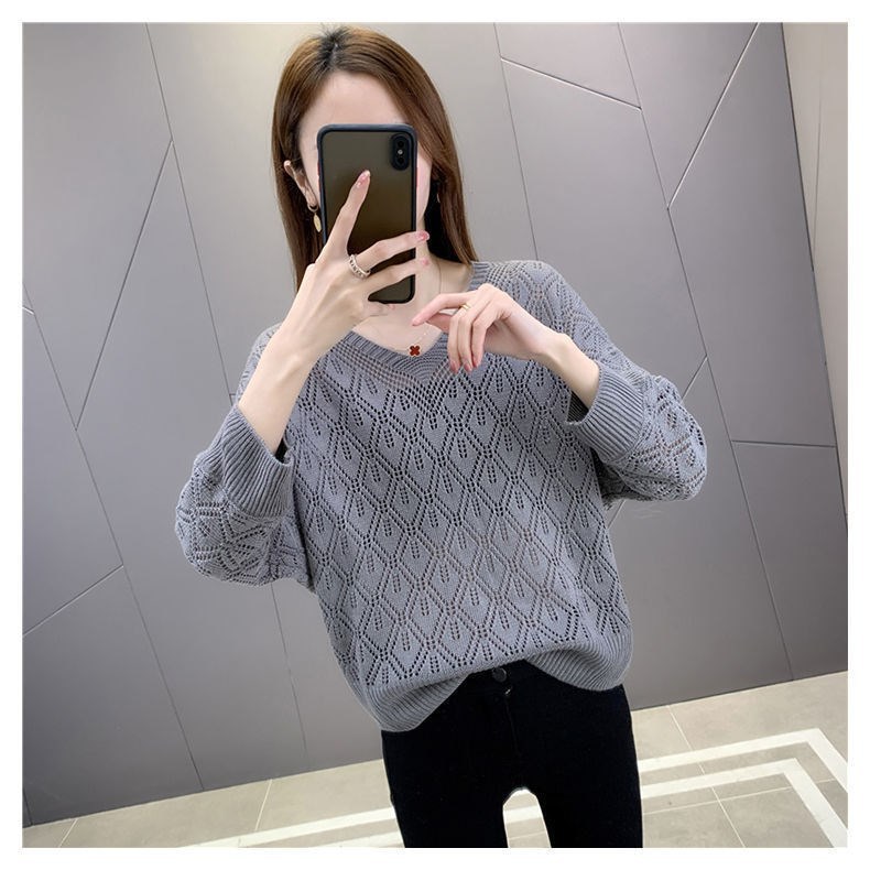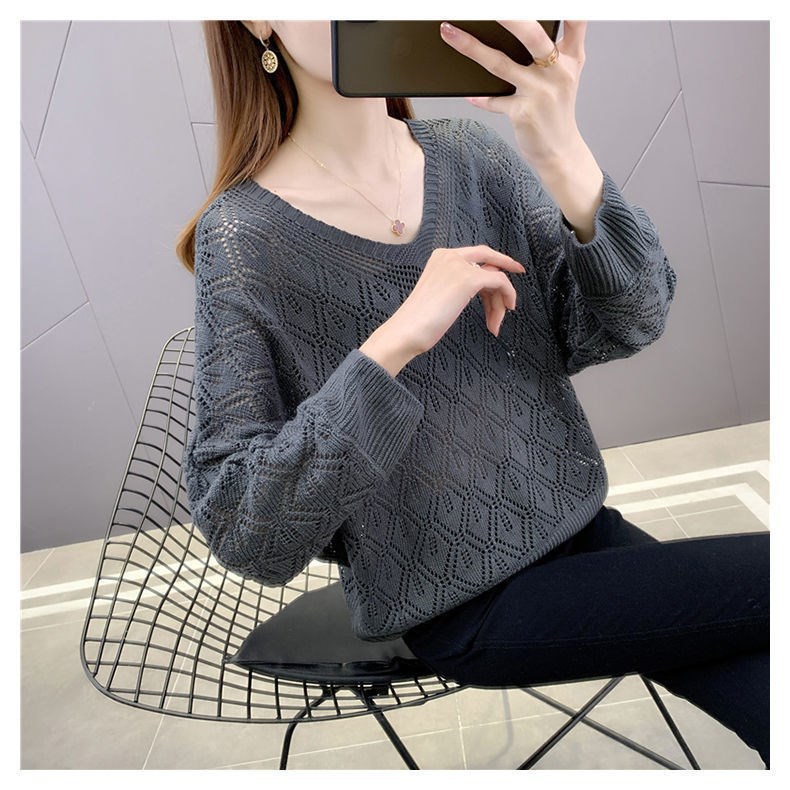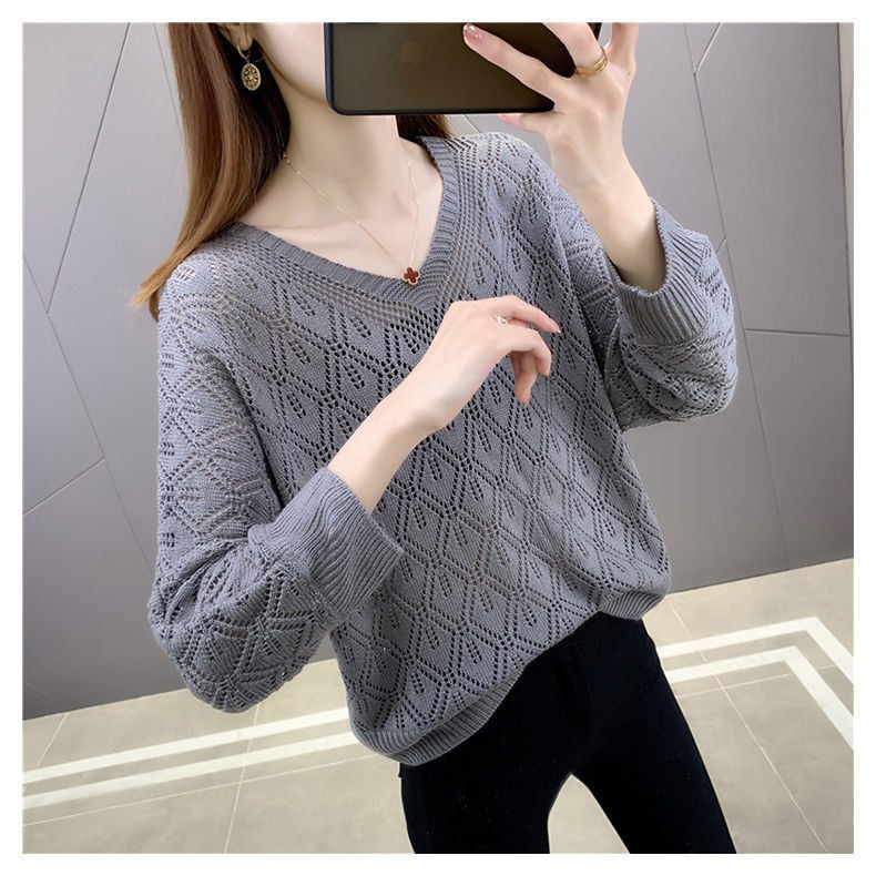 가을 새 옷 얇은 티셔츠 V 넥 중공 바닥 스웨터 여성 느슨한 도매 여성 탑