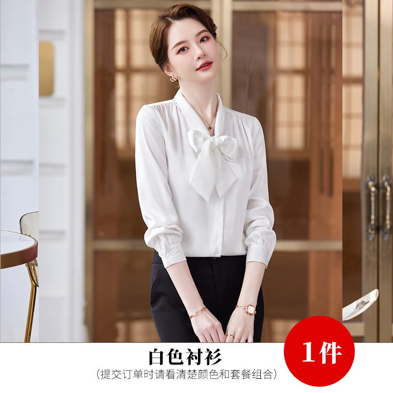 蝴蝶结系带白色衬衫女士长袖衬衣秋款上衣V领雪纺衫职业衬衫女装