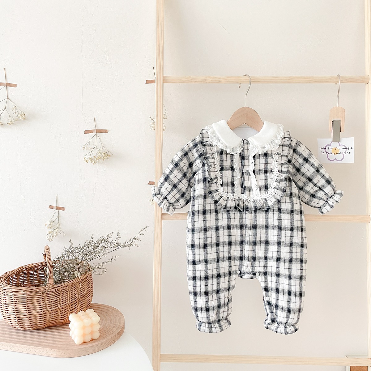 아기 옷 가을과 겨울 신생아 점프 수트 한국식 격자 무늬 아기 소녀의 등산 스타일 두꺼운 따뜻한 외출면