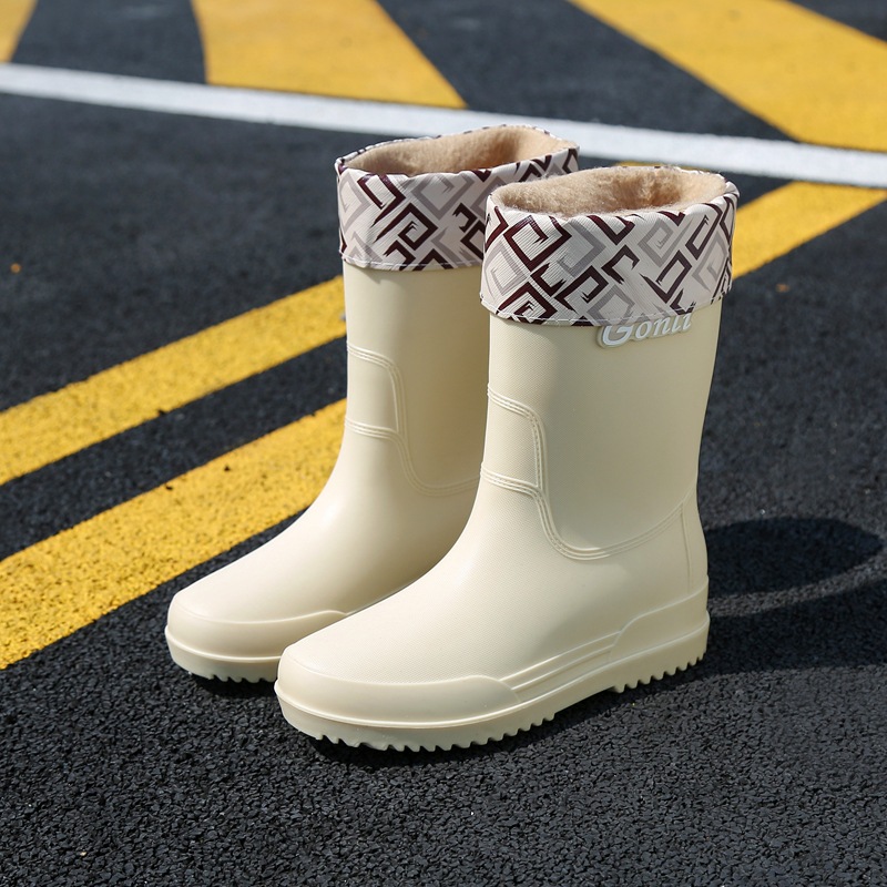 비 부츠 여성의 세련된 야외 작업 신발 두꺼운 밑창 중반 송아지 방수 미끄럼 방지 레인 부츠 기모 따뜻한 물 신발 여성스토어 가기