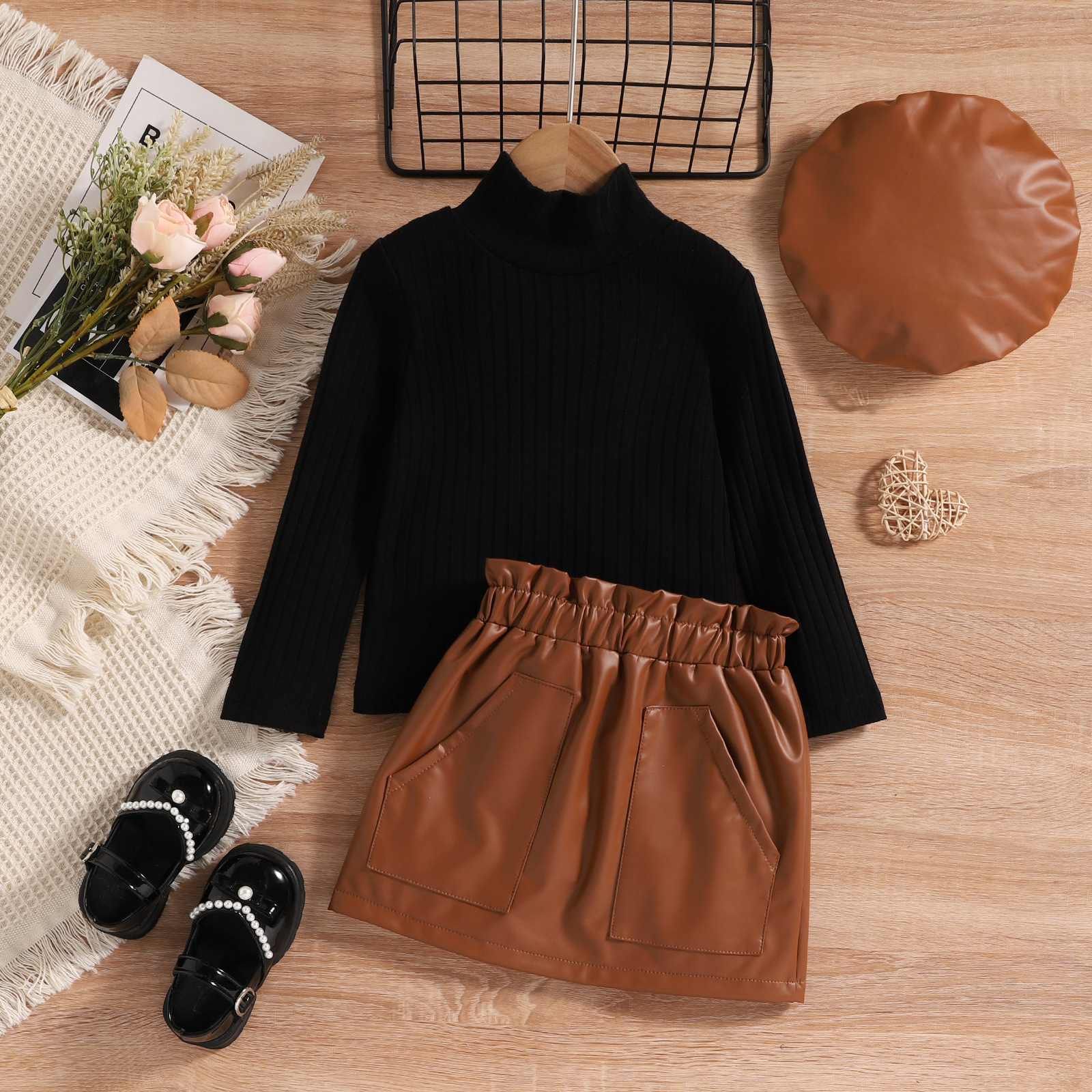 Bao Xin 아동복 유럽 미국 22 가을과 겨울 New Girls 소형 하이 칼라 긴 소매 베이스 + 가죽 스커트 + 모자 쓰리피스 세트