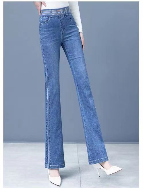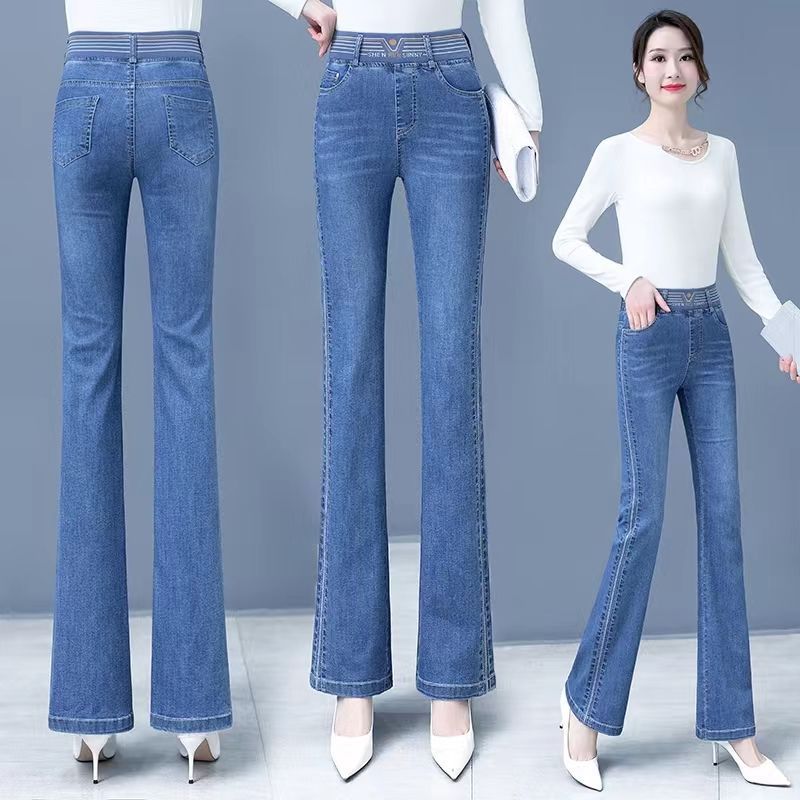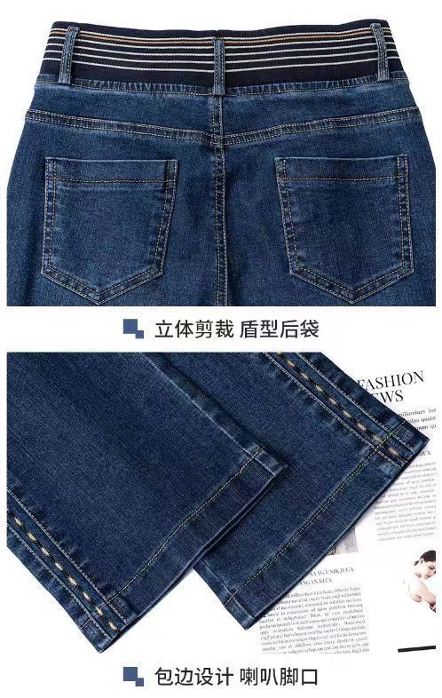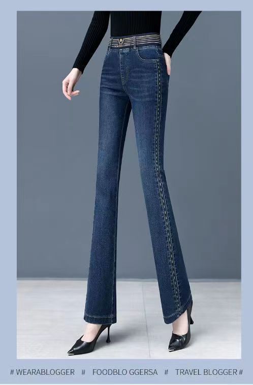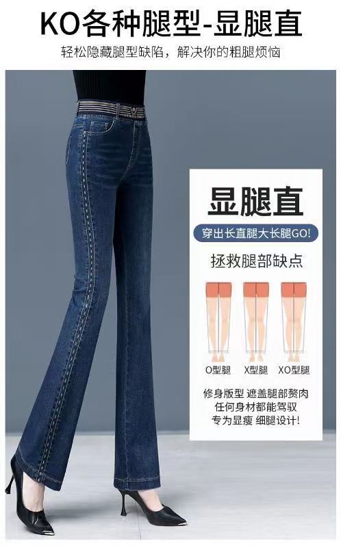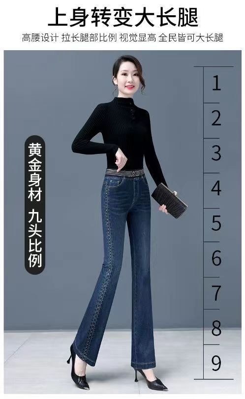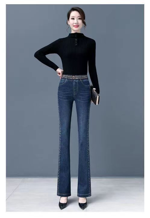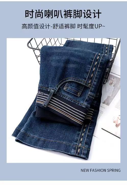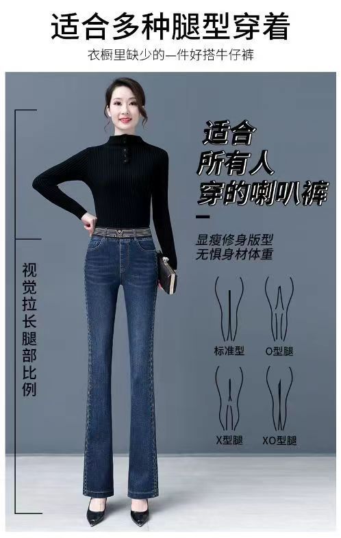 탄성 허리 청바지 여성 바지 봄, 가을 새로운 탄성 부츠 컷 바지 여성을위한 높은 허리 플러스 벨벳 플레어 바지스토어 가기