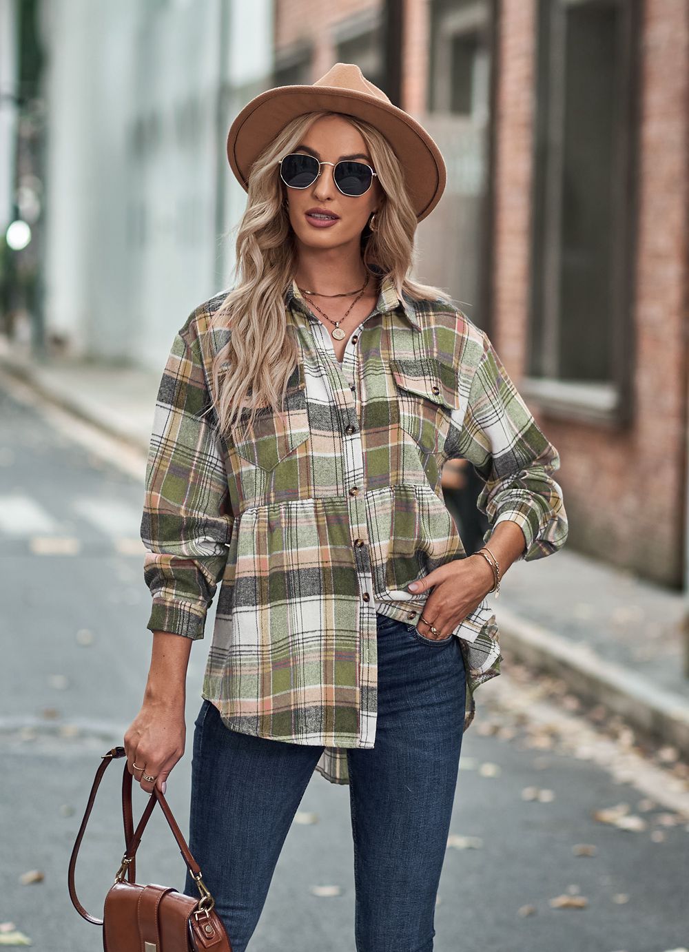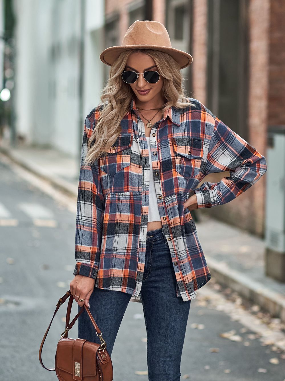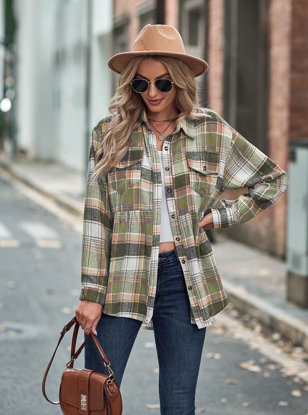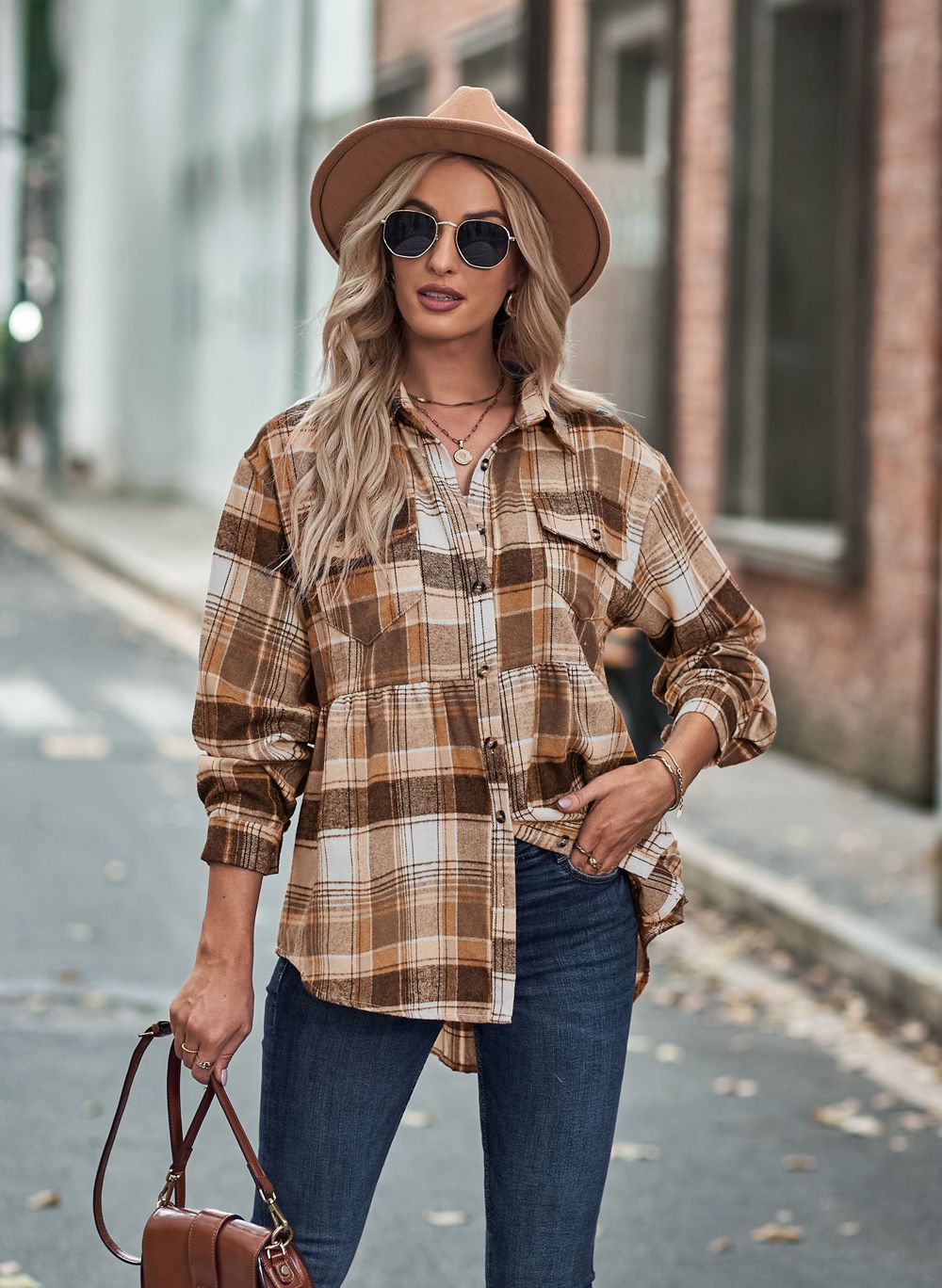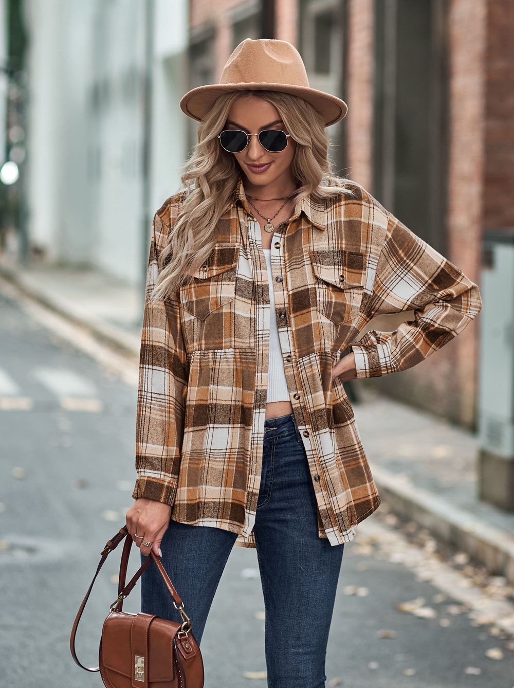 2025 크로스보더 여성상의 아마존 가을 겨울 신제품 라펠 긴팔 포켓 캐주얼 유럽 및 미국 격자 무늬 셔츠스토어 가기