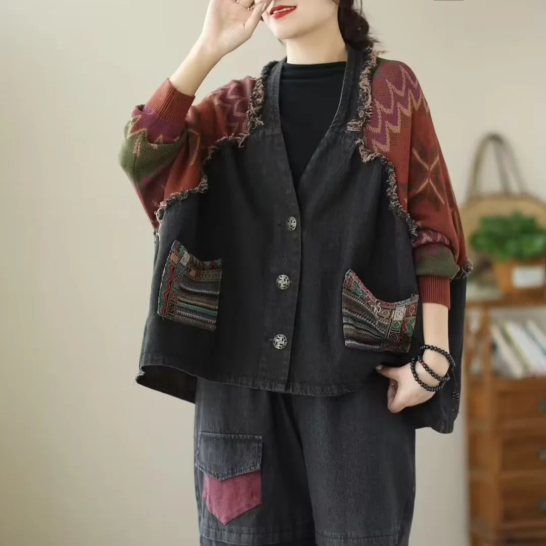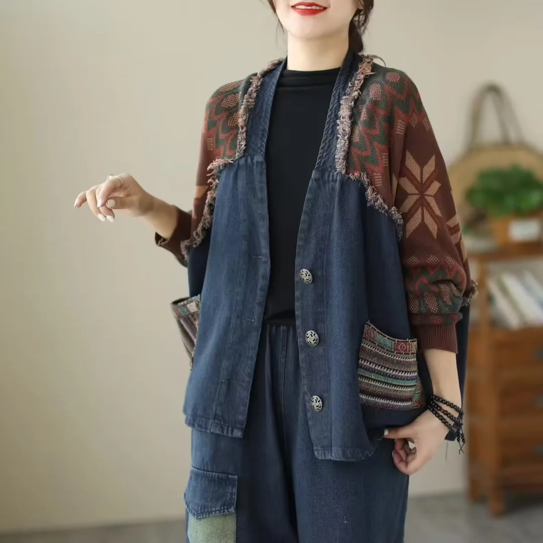 22 가을 새로운 예술적 캐주얼 플러스 사이즈 맞춤형 니트 데님 스티칭 긴 소매 코트스토어 가기