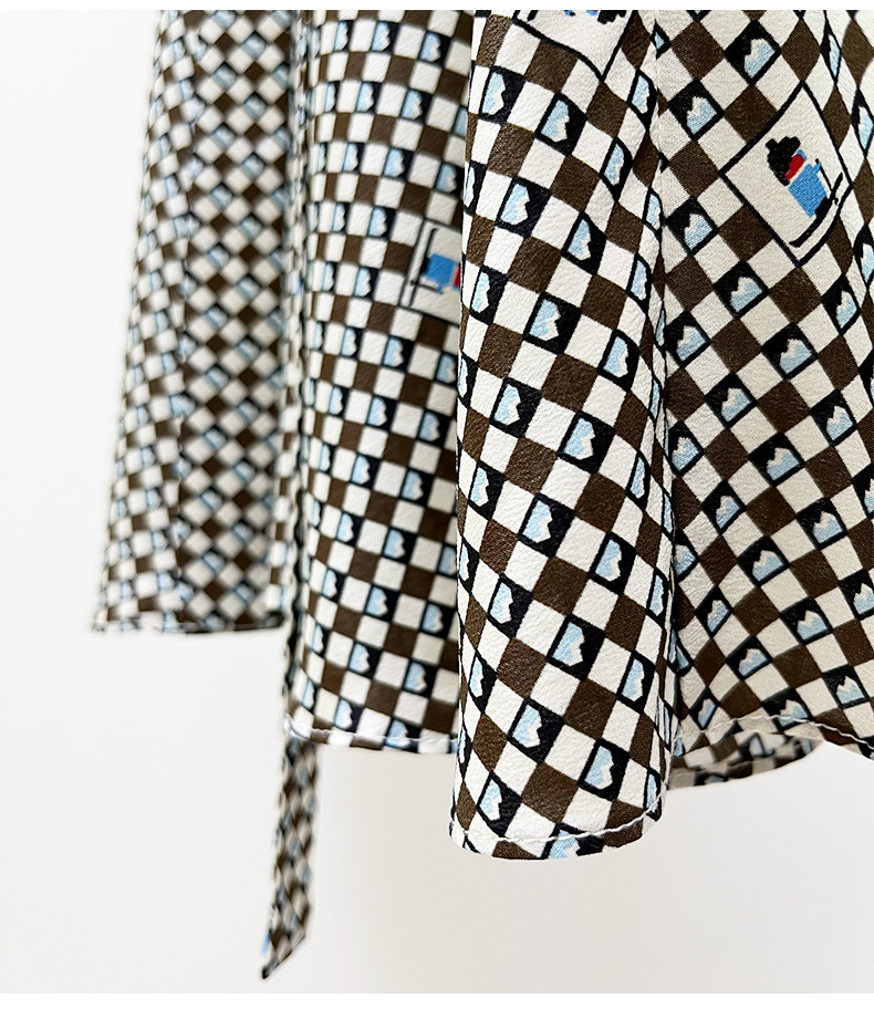 22 새로운 실크 원피스 스노우 마운틴 격자 무늬 꽉 허리 슬리밍 중간 길이 인형 칼라 복고풍 인쇄 퍼프 소매