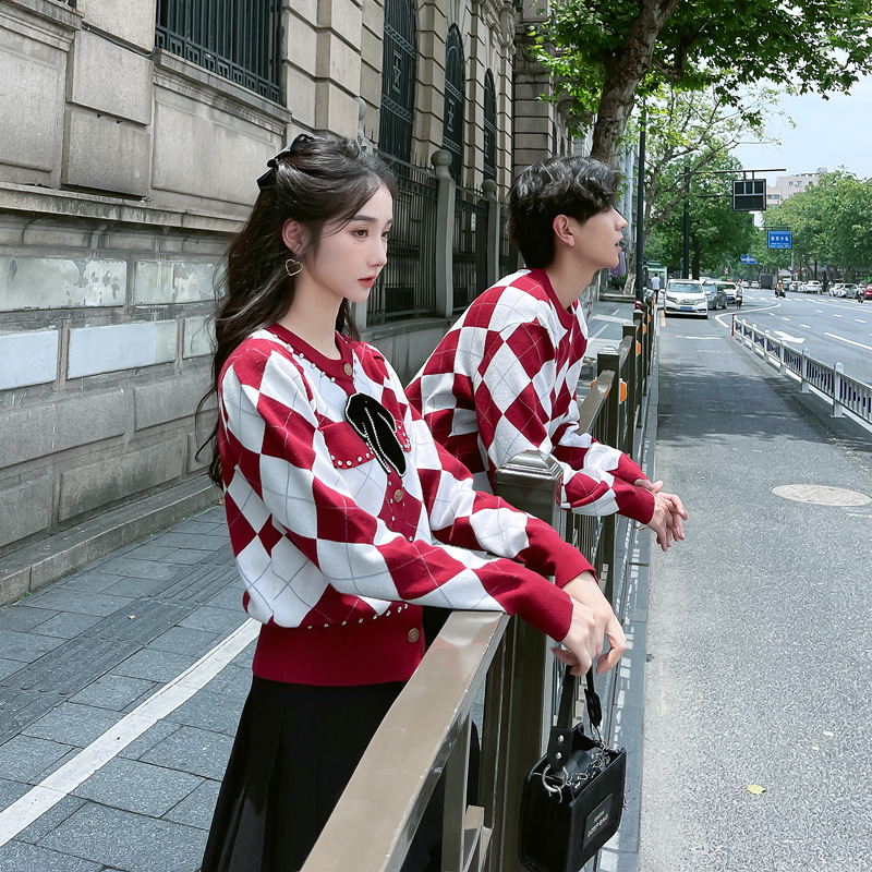 가을 2022 달콤한 신선한 격자 무늬 여성용 짧은 슬림 핏 니트 카디건 남성용 둥근 목 외부 스웨터 커플 착용