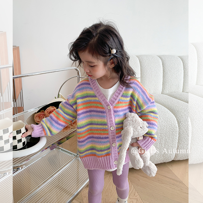 이모 베이 베이 한국 봄 새 아동복 소녀의 달콤한 우아한 레인보우 니트 스웨터 카디건 재킷
