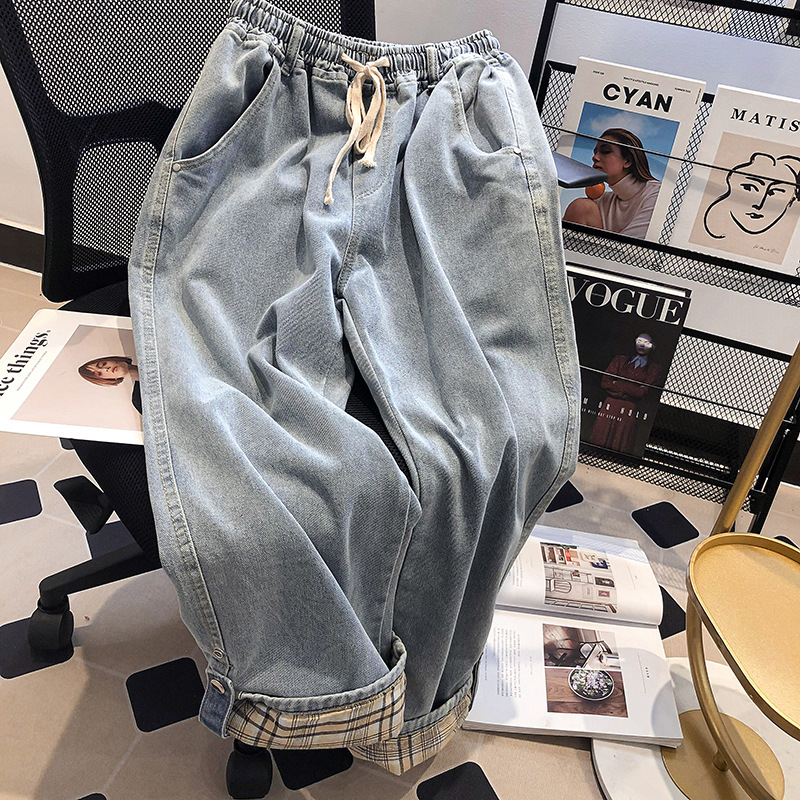 100-150kg 팻mm 가을 루즈핏 스트레이트 레그 커프스 데님 팬츠 여성용 110kg 신축성 있는 허리끈 하이웨이스트 팬츠 슬림핏스토어 가기