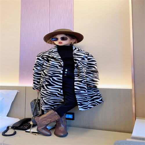 소년과 소녀를위한 어린이 새 모직 코트 2023 가을과 겨울 한국식 두꺼운 얼룩말 패턴 큰 어린이를위한 중간 길이 코트스토어 가기