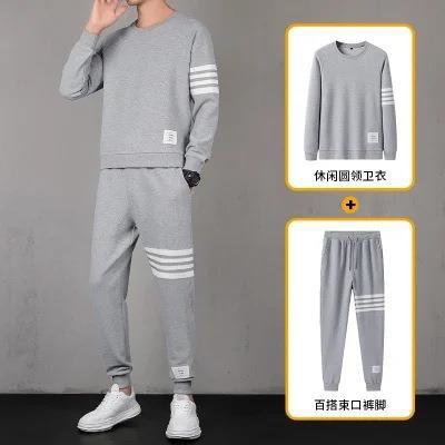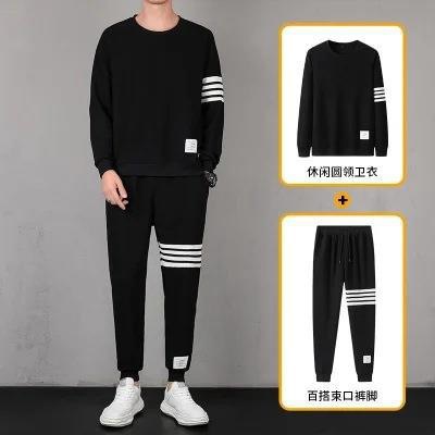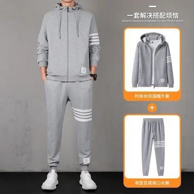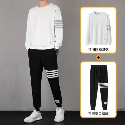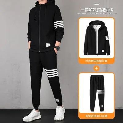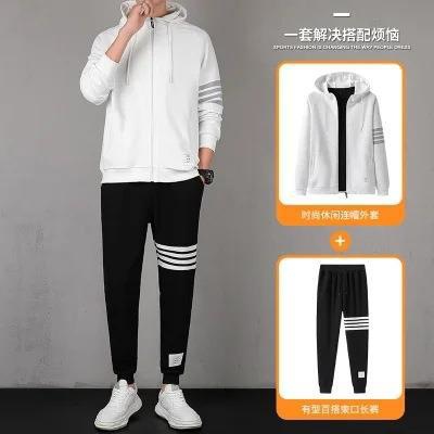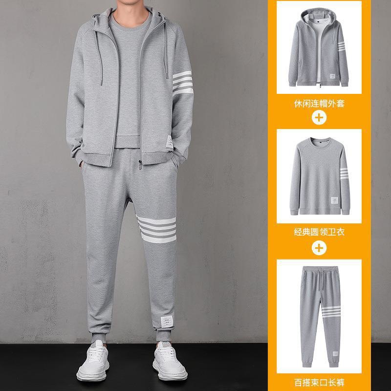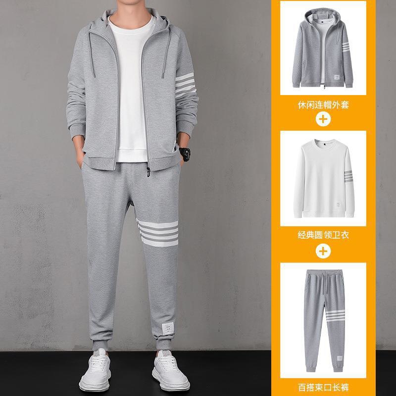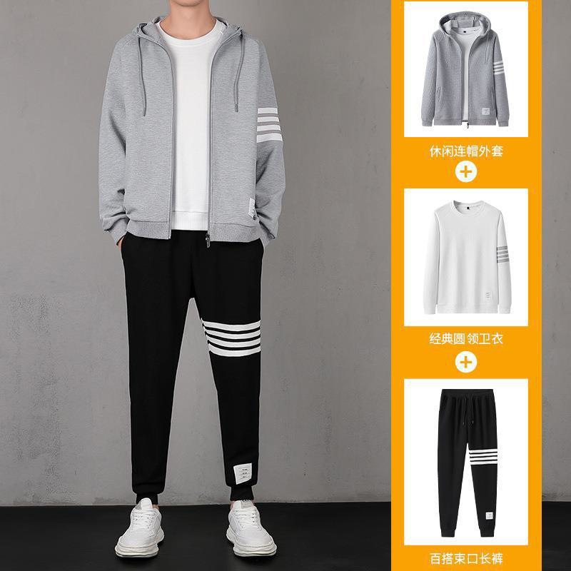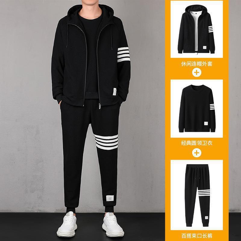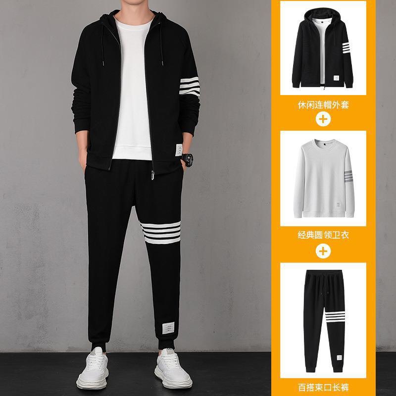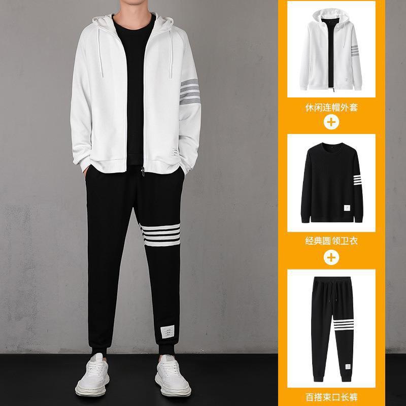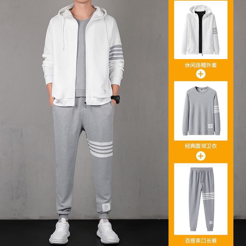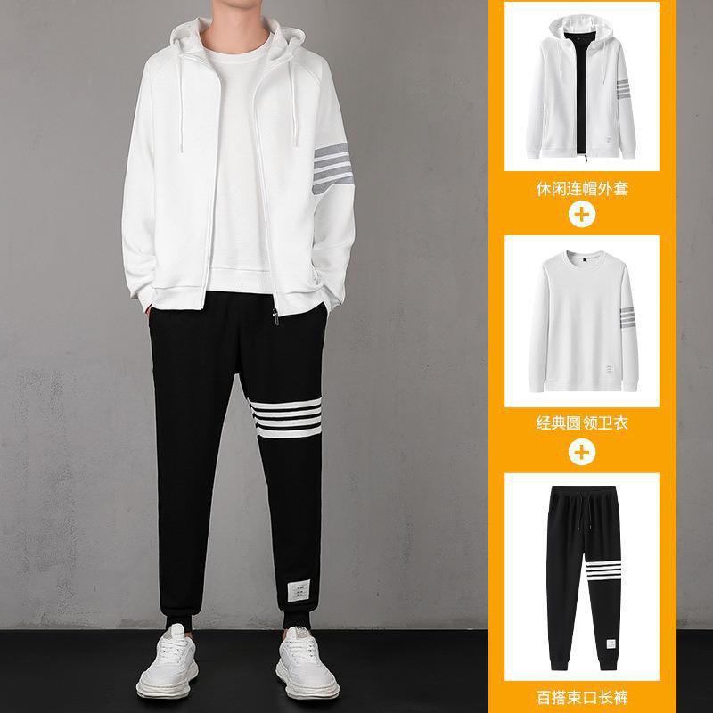 2021秋季新款华夫格男连帽上衣长裤套装运动四条杠休闲三件套
