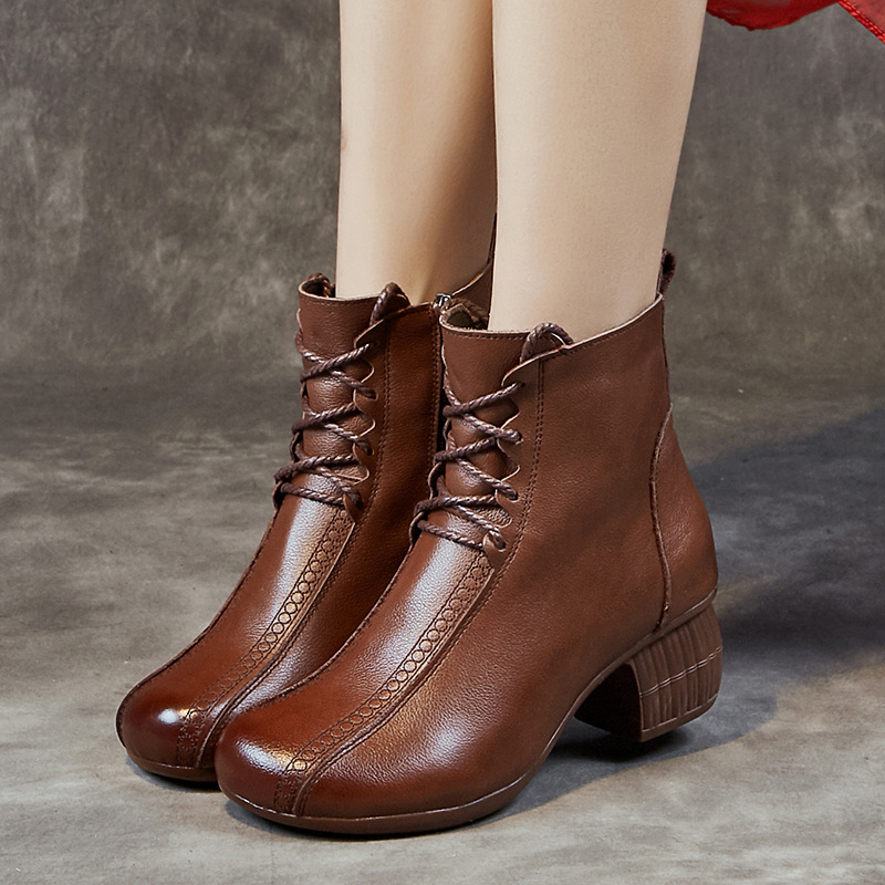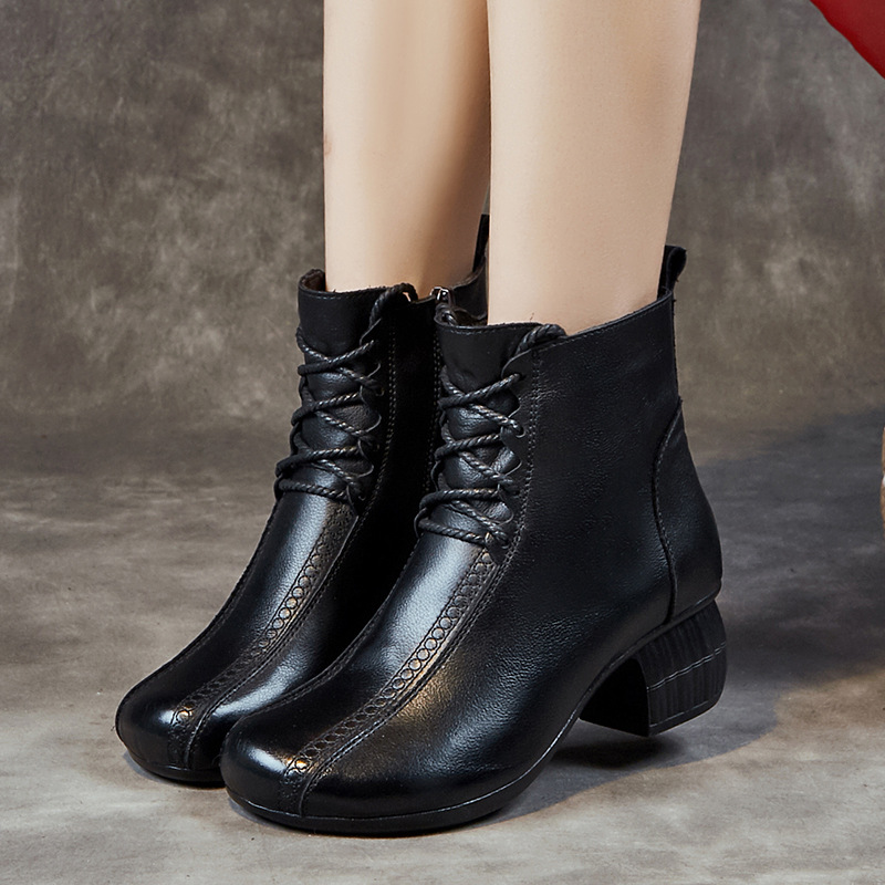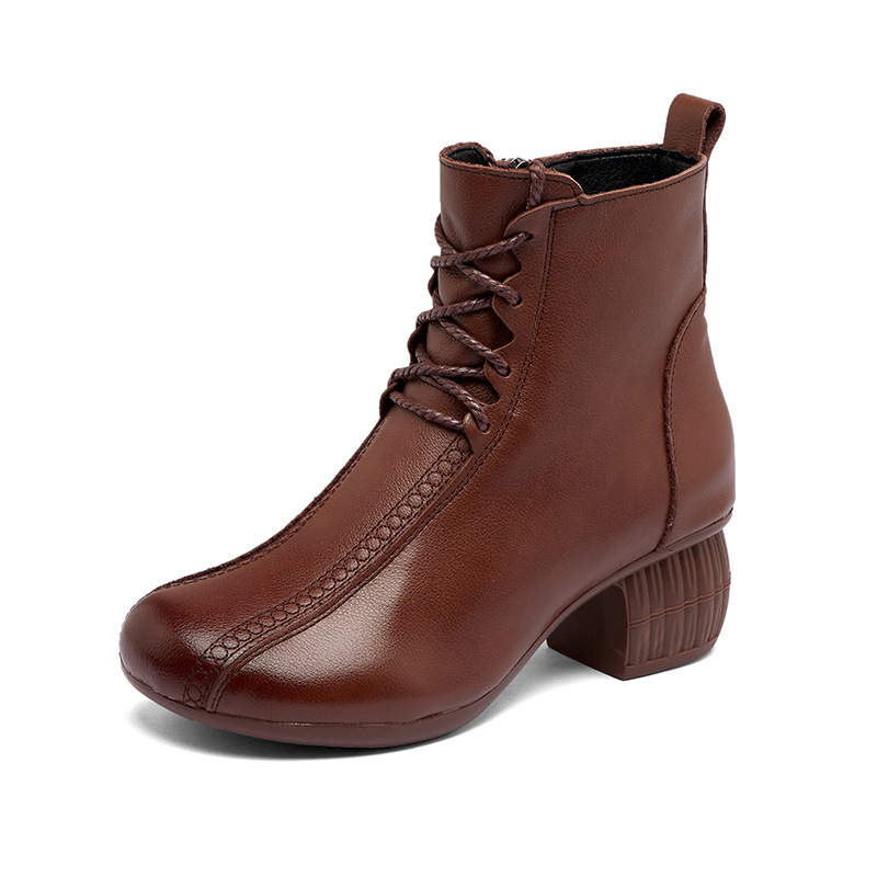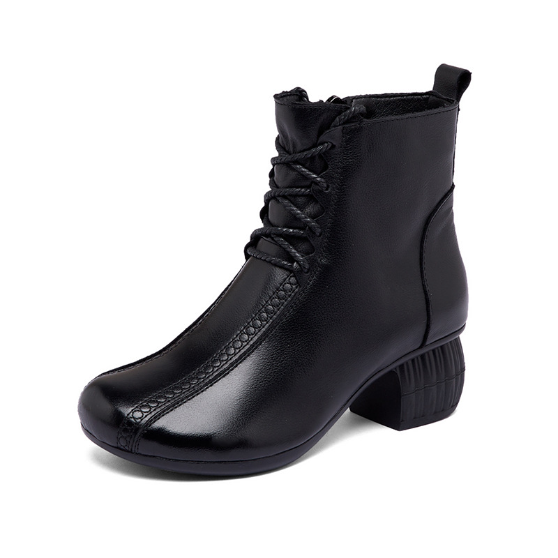 부츠 여성 2022 새로운 가을과 겨울 두꺼운 뒤꿈치 기모 짧은 부츠 탑 레이어 소가죽 중년 캐주얼 라운드 헤드 마틴 부츠 도매스토어 가기