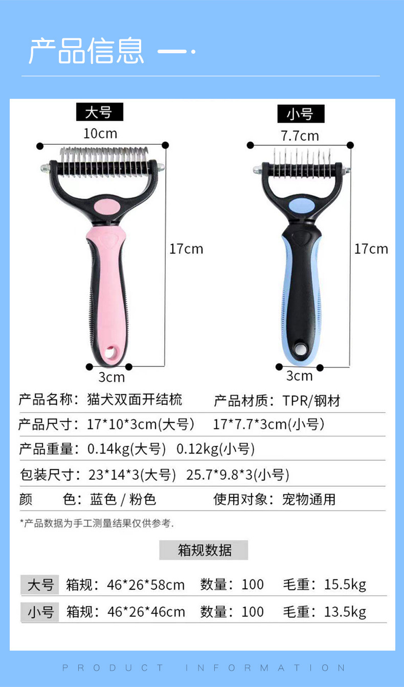 애완 동물 용품 개 헤어 클리너 애완 동물 양면 오픈 매듭 빗 털 뜨는 개 청소 고양이 개 미용 갈퀴 빗