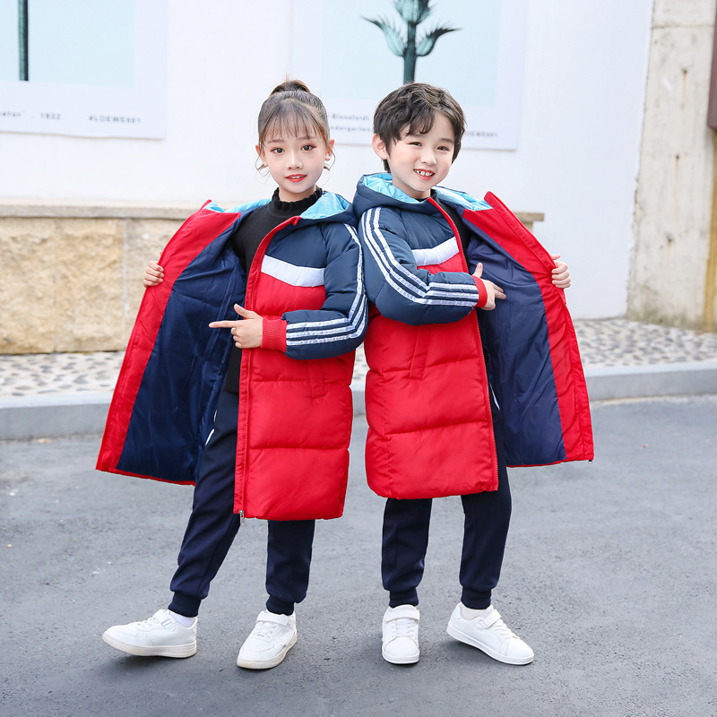 2022 가을과 겨울 소년과 소녀를위한 중간 및 긴 면 패딩 재킷 초등 및 중등 학생을위한 유치원 정원 옷 두꺼운 교복 빨간 코트스토어 가기